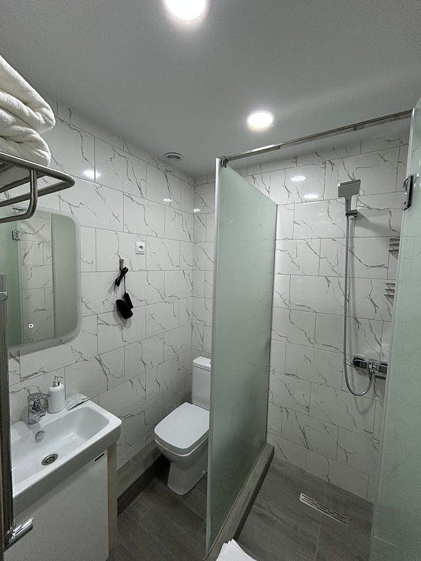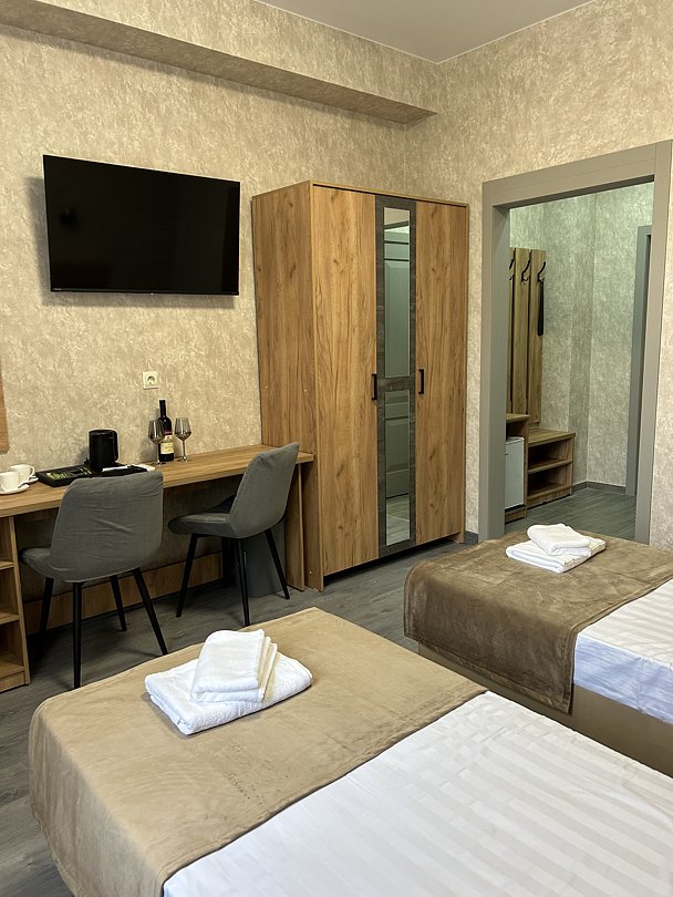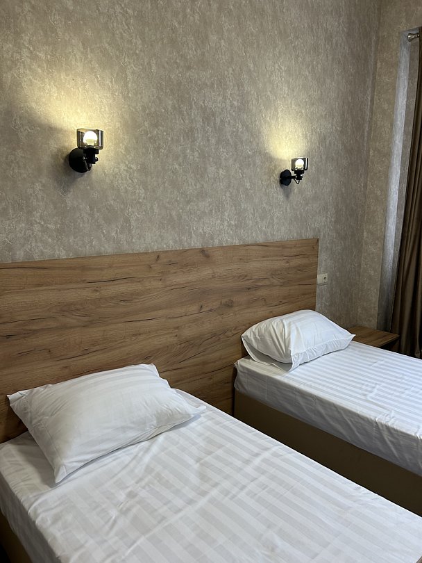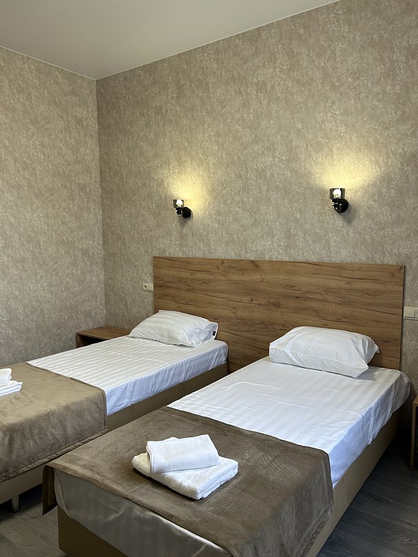 Уютная двуспальная кровать или две односпальные. Светлый просторный интерьер в теплых тонах. Современные удобства: ТВ, Wi-Fi, чайный набор, кондиционер, холодильник. Ванная комната с душем, средствами гигиены.