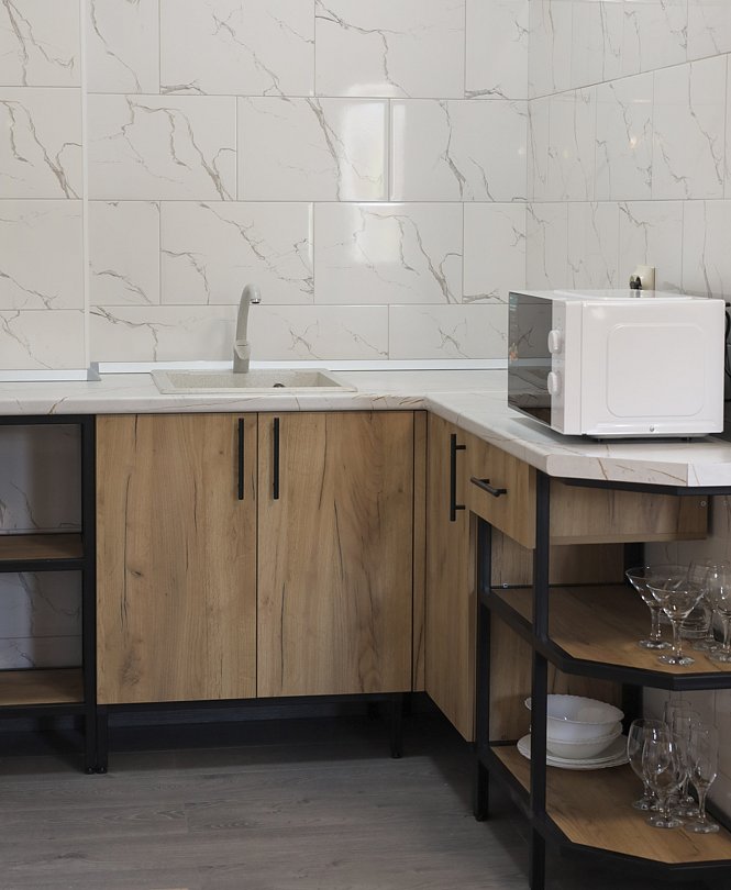 - холодильник, СВЧ-печь, чайный сет, столовые приборы и посуда;