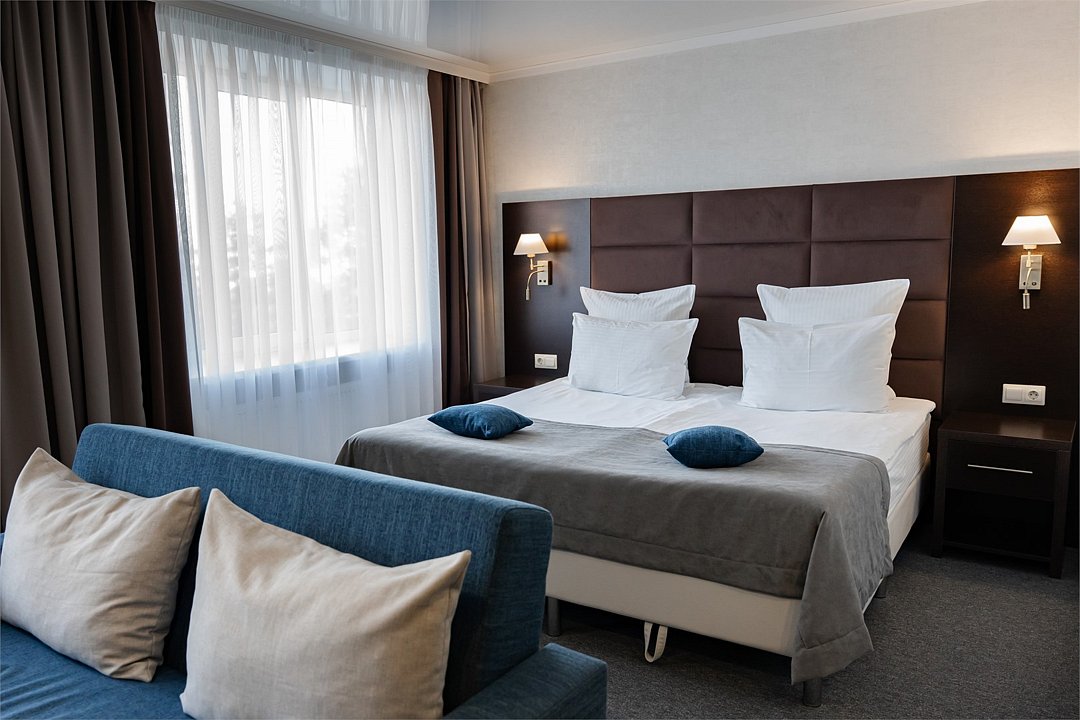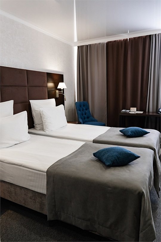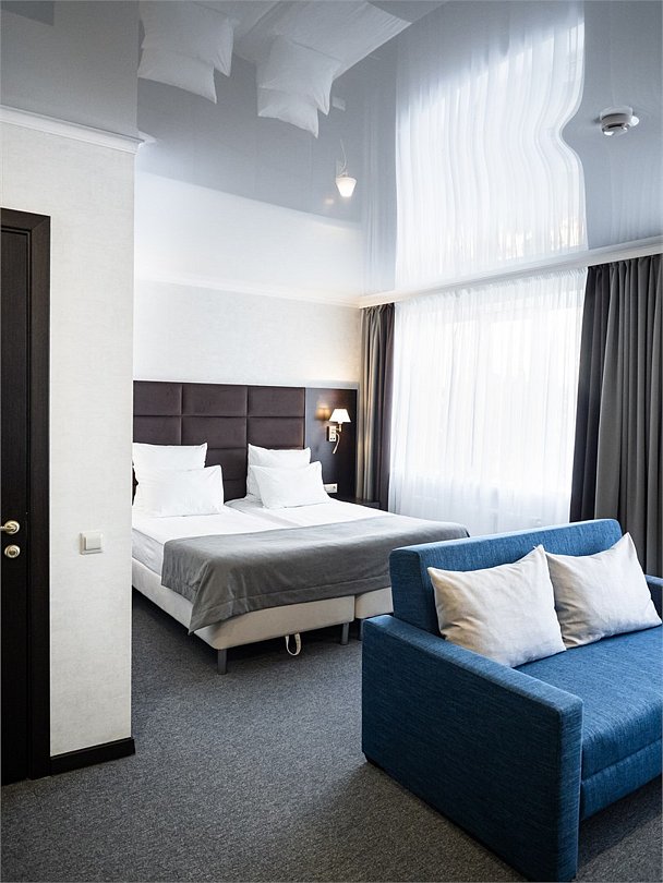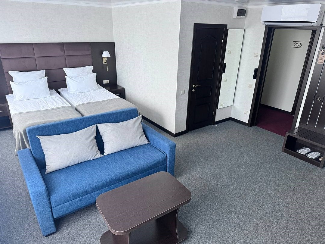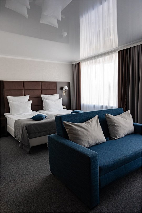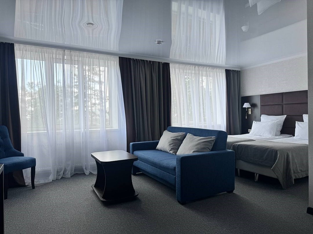 Просторный номер для одного или двух человек с гостиной зоной. Приятно порадует глаз вид из окна, а наличие диванчика в номере позволит комфортно разместиться семье с ребенком. Удобные кровати с ортопедическим матрасами могут при необходимости быть собранными в одну большуюУслуги и удобства