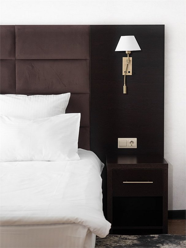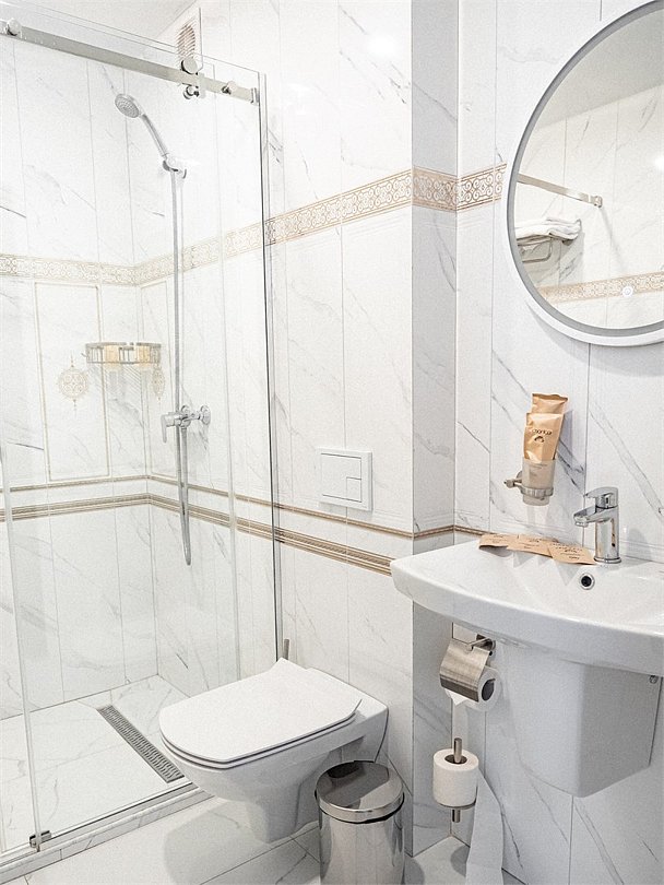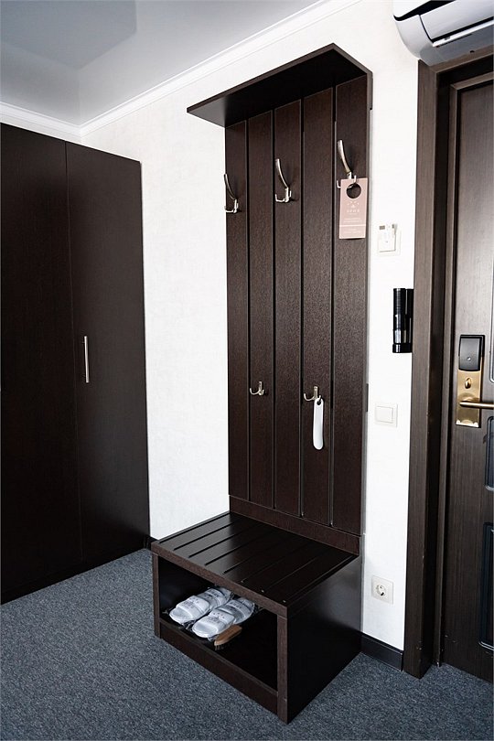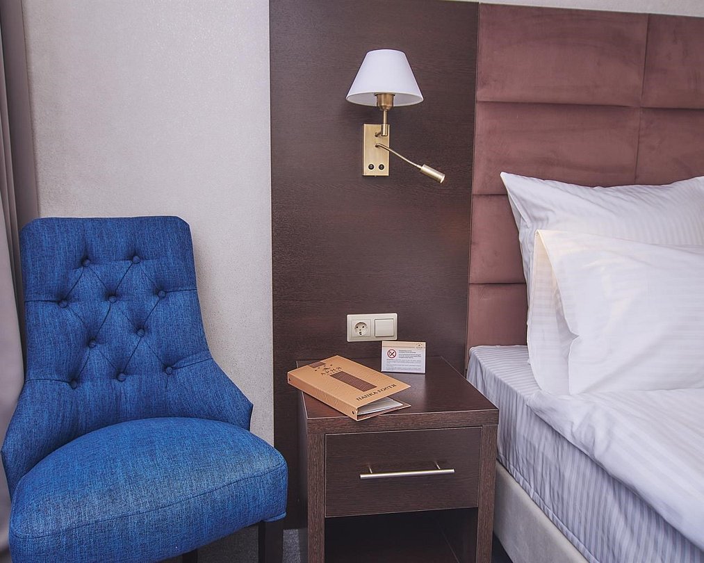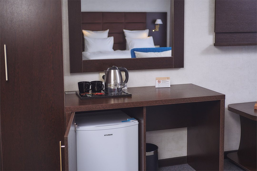Wi-Fi, кондиционер, светильник, настольные лампы, фен, электронные замки, душевая кабина, санузел, халаты, банные полотенца, тапочки, косметические средства, двуспальная кровать, тумбы, шкаф для одежды, вешалки, журнальный столик, письменный стол, багажная тумба, зеркало, письменные принадлежности, информационная карта, меню, сейф, чайник, унитаз, раковина, косметическое зеркало, ковровое покрытие, отопление, вид на город, кулер на этаже, центральное кондиционирование, стаканы, стул, туалетный столик, цифровое тв, раскладной диван, внутренний телефон, мини-холодильник, номер для некурящих, можно с питомцамиВ гостиничном номере