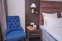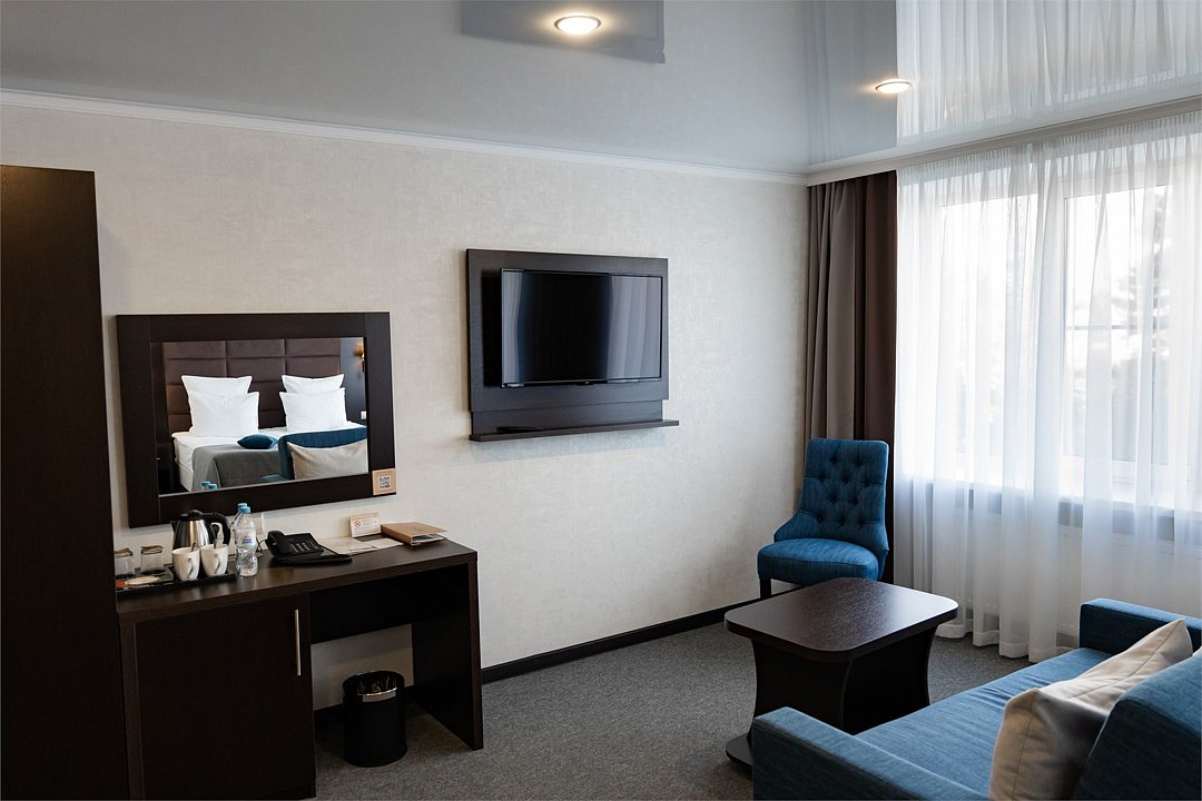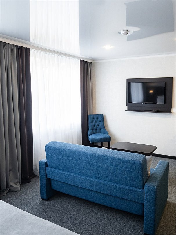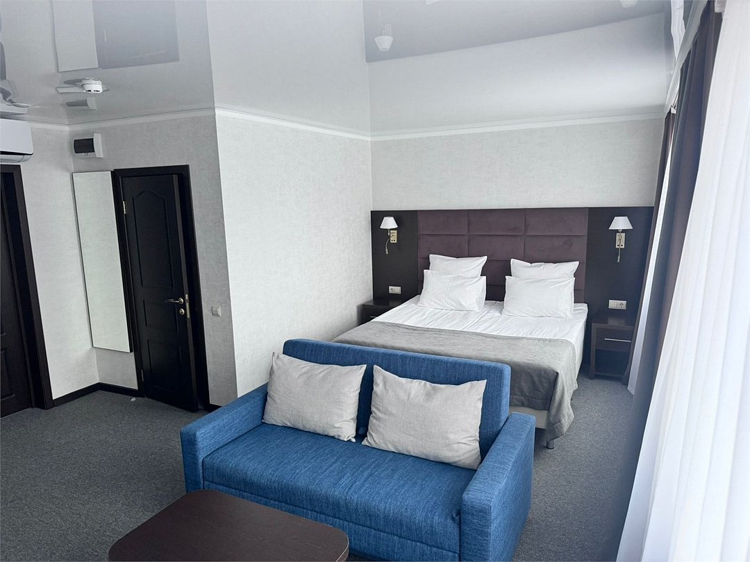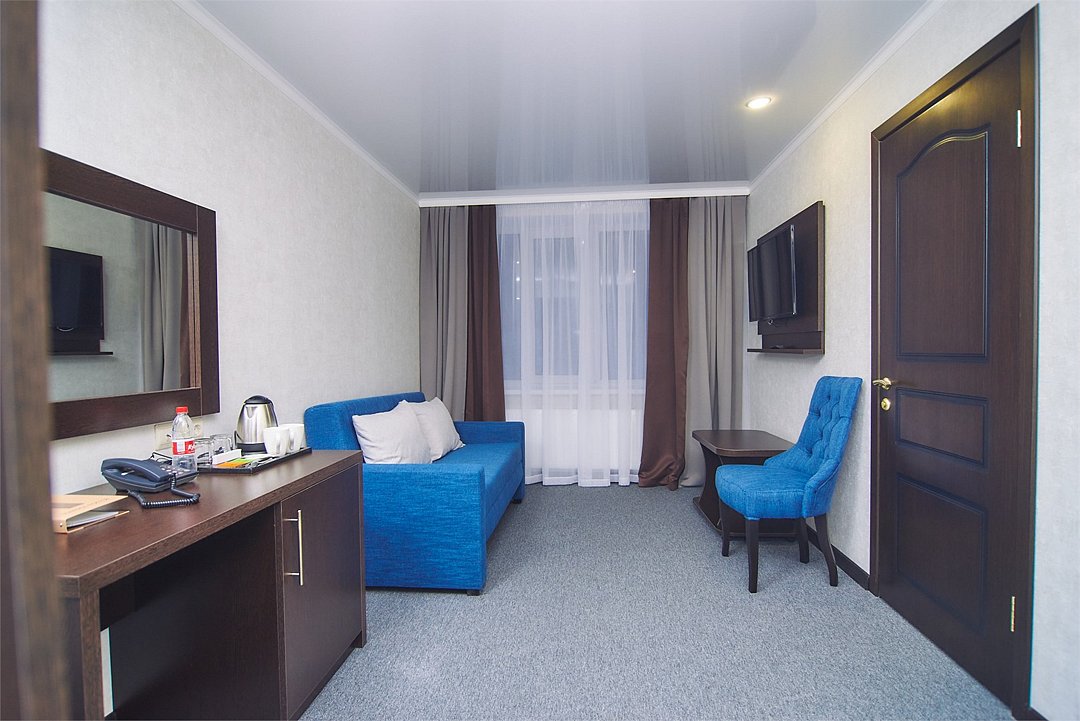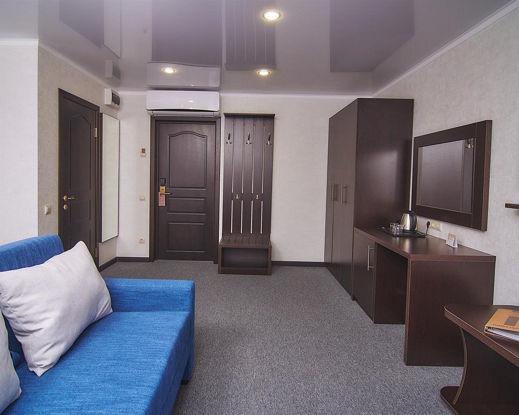 Просторный номер для одного или двух человек с гостиной зоной. Приятно порадует глаз вид из окна, а наличие диванчика в номере позволит комфортно разместиться семье с ребенком. Удобная кровать-трансформер с ортопедическим матрасом может быть как большой двуспальной кроватью, так и двумя отдельными.Услуги и удобства