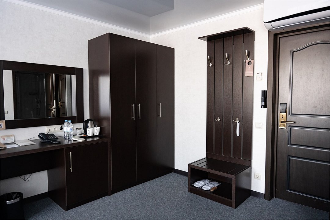 Wi-Fi, кондиционер, система климат-контроля, светильник, настольные лампы, фен, электронные замки, душевая кабина, санузел, халаты, банные полотенца, тапочки, косметические средства, две односпальные или большая двуспальная кровать, шкаф для одежды, вешалки, багажная тумба, зеркало, письменные принадлежности, информационная карта, меню, сейф, чайник, унитаз, раковина, косметическое зеркало, ковровое покрытие, отопление, кулер на этаже, центральное кондиционирование, стаканы, туалетный столик, цифровое тв, внутренний телефон, мини-холодильник, вид на горы, номер для некурящих, вид на лес, пуфик, можно с питомцамиВ гостиничном номере
