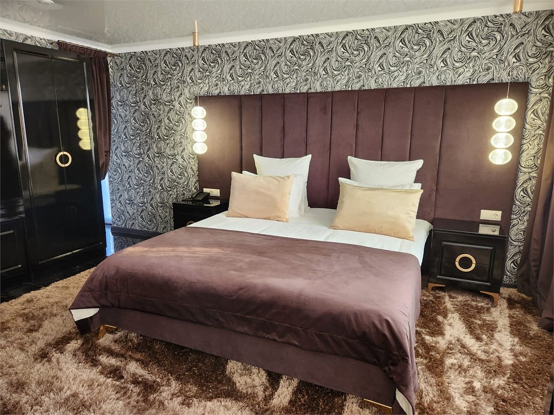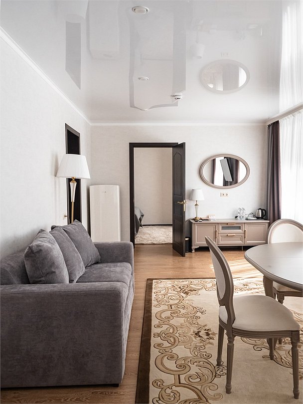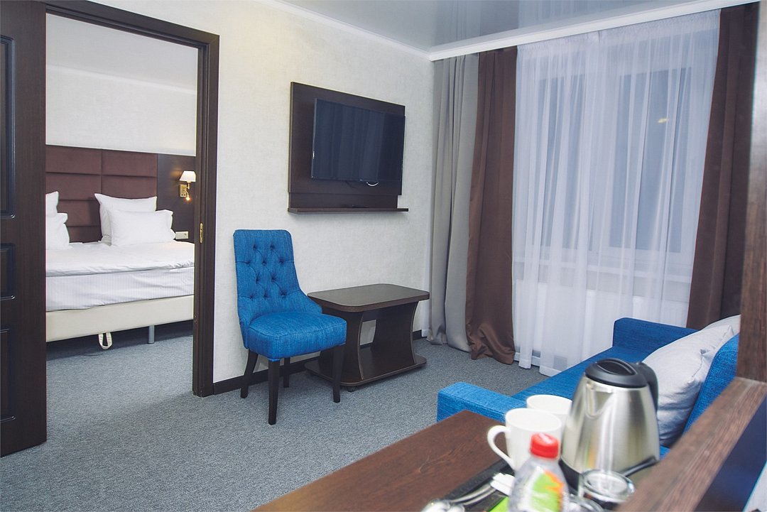 два телевизора, Wi-Fi, система климат-контроля, светильник, настольные лампы, фен, электронные замки, утюг, душевая кабина, санузел, халаты, банные полотенца, тапочки, косметические средства, двуспальная кровать, гладильная доска, кресла, тумбы, шкаф для одежды, вешалки, журнальный столик, багажная тумба, зеркало, две комнаты, информационная карта, меню, сейф, чайник, унитаз, раковина, питьевая вода, ковровое покрытие, отопление, кулер на этаже, центральное кондиционирование, вид во двор, стаканы, туалетный столик, туалетный столик, цифровое тв, раскладной диван, внутренний телефон, мини-холодильник, номер для некурящих, можно с питомцамиВ гостиничном номере
