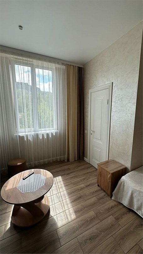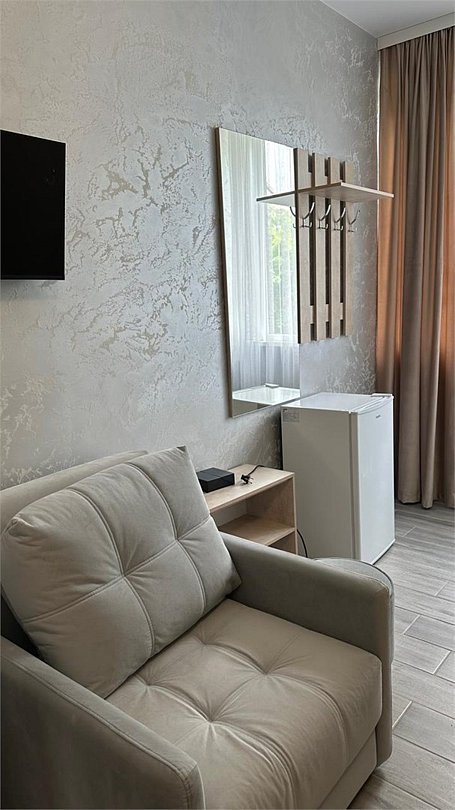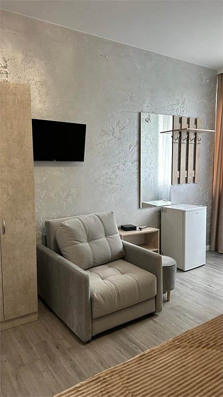 Уютный однокомнатный номер с просторной двуспальной кроватью.Размером200/200 и доп. местом в виде кресло-кроватью с пружинным блоком. Номер оборудован всем необходимым для комфортного проживания: холодильником, телевизором, так же предоставляется фен, разовые тапочки.Услуги и удобства