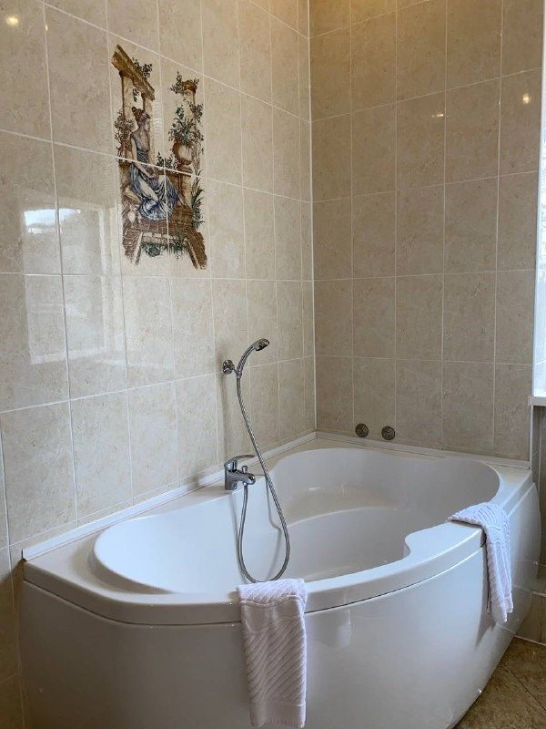 В ванной нет шторки совсем. При этом сама ванная весьма просторная, но принимать душ можно только сидя, иначе всё залито.