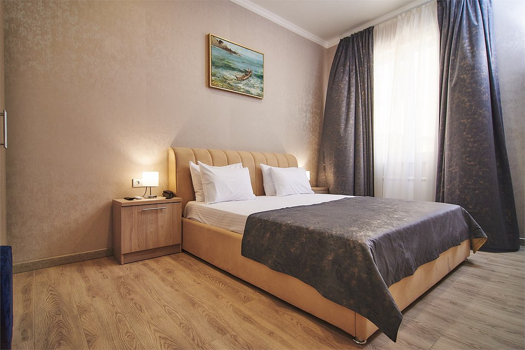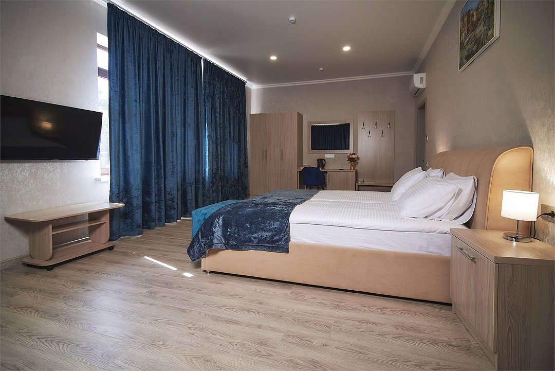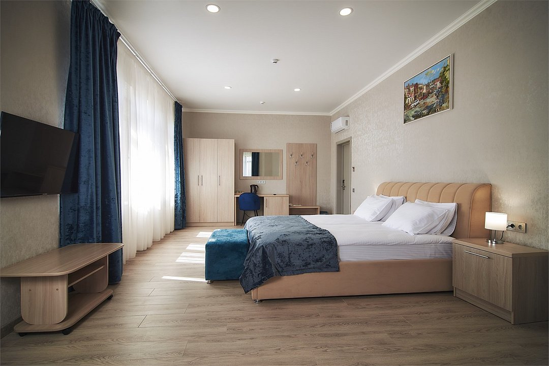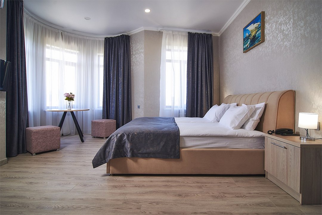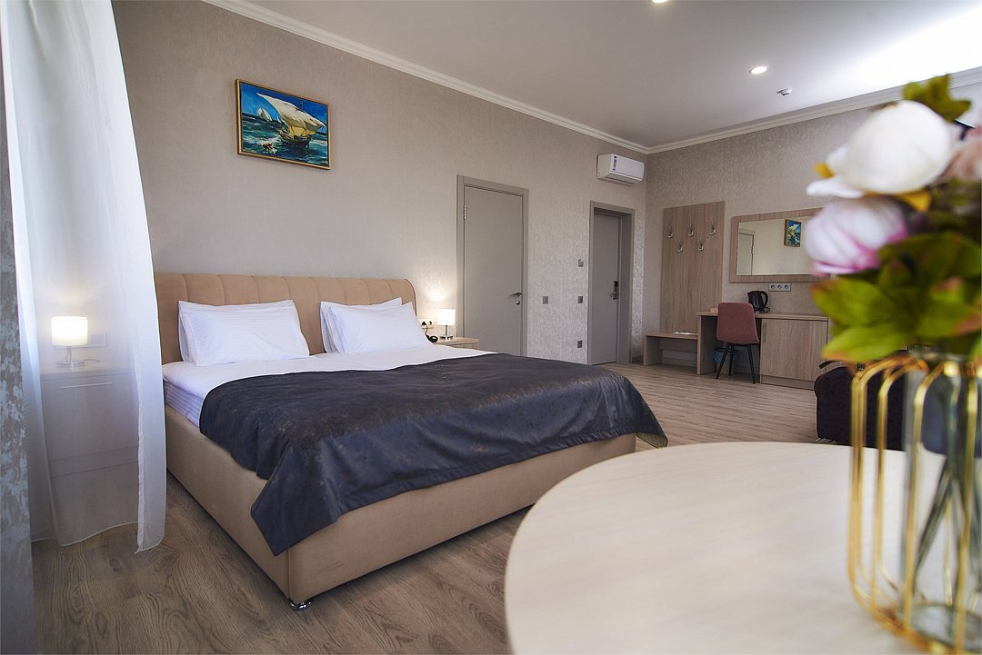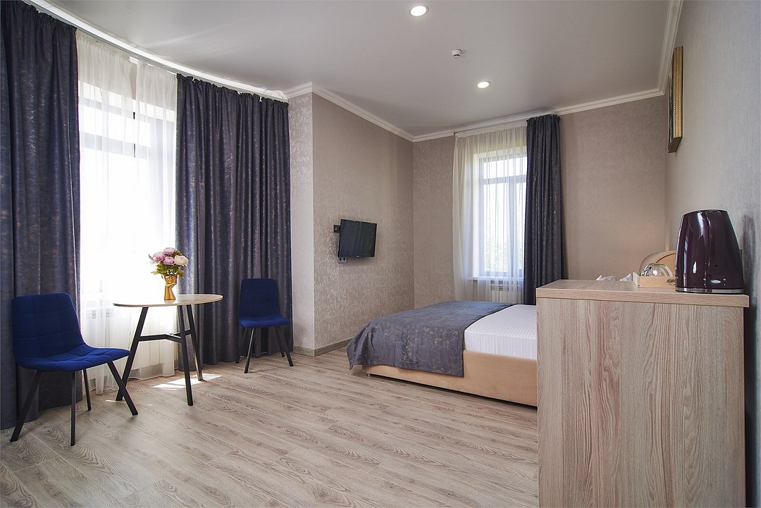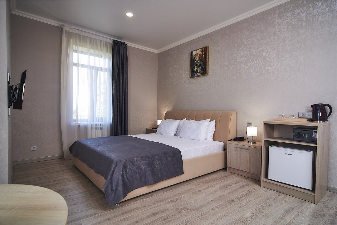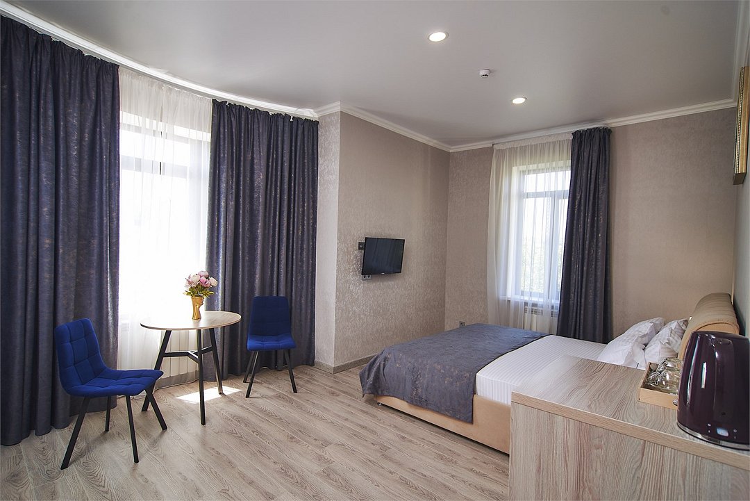 Однокомнатный номера вместимостью до четырех человек общей площадью от 28 до 30 м² отвечает всем современным требованиям комфорта и отдыха, оборудован индивидуальной системой кондиционирования, кроватью размера «King Size» с ортопедическим матрасом и мягким изголовьем, столом со стульями и пуфиками, сейфом, принадлежностями для приготовления чая, холодильником, телевизором с плоским экраном и смарт TV, звуконепроницаемыми окнами. В вашем распоряжении ванная комната с душевой кабиной, туалетом, гигиенический душем, феном, полотенцами и косметическим принадлежностями. К услугам гостей ежедневная уборка номеров. Уважаемые гости, всего 3 номера данной категории снабжены балконами, в связи с этим отель не может давать гарантию заселения именно в такой номер.Услуги и удобства