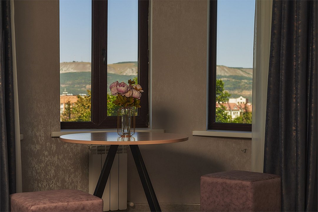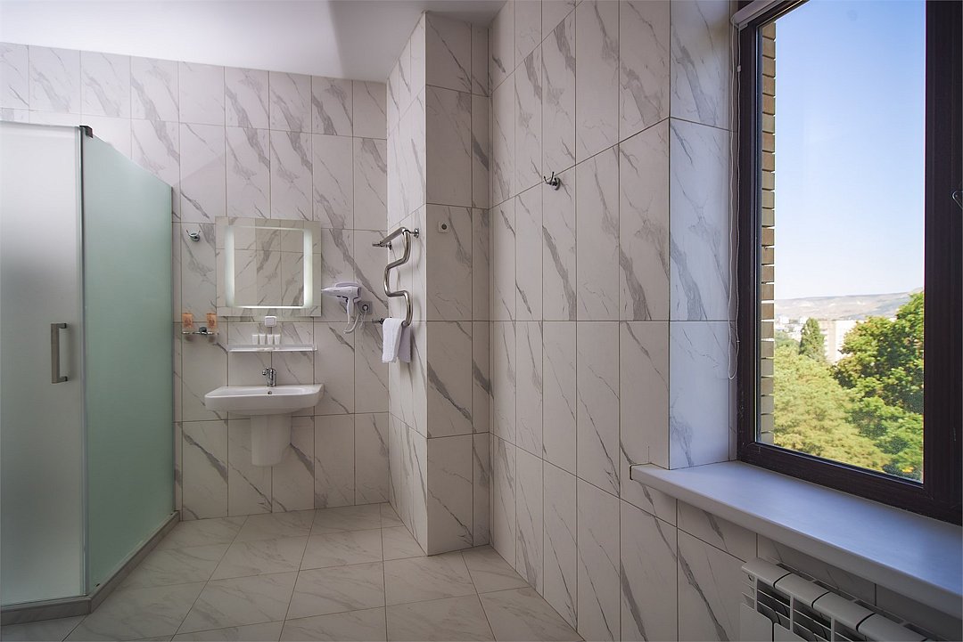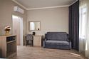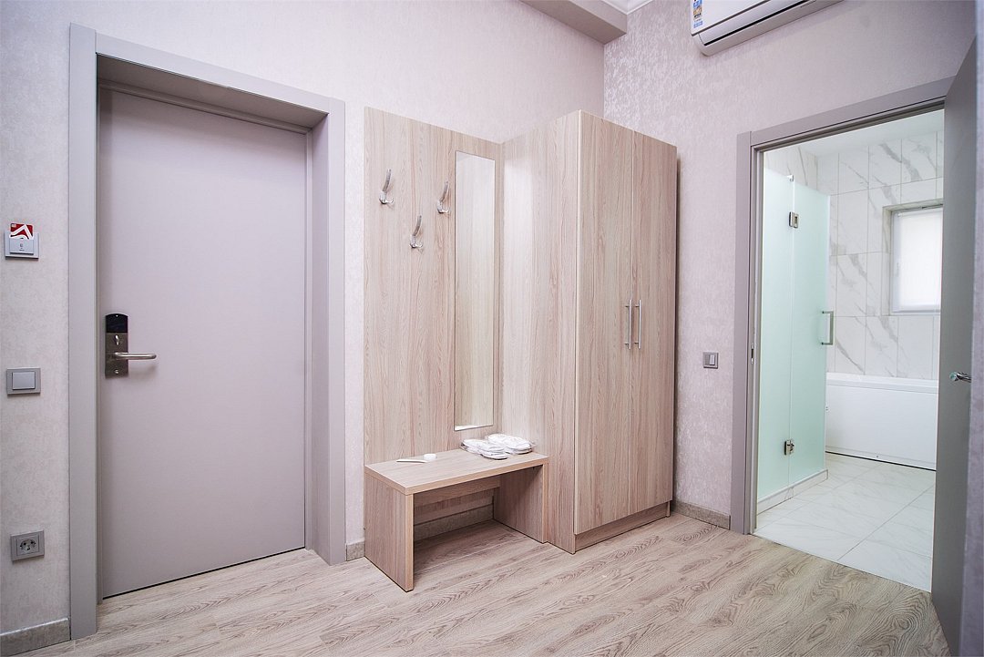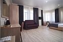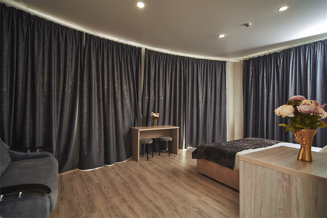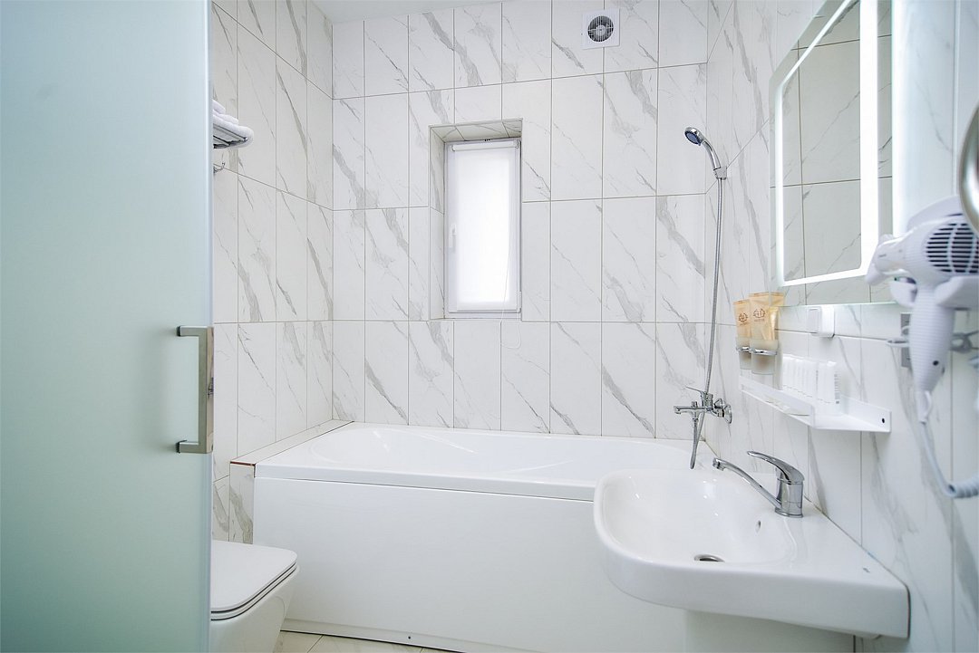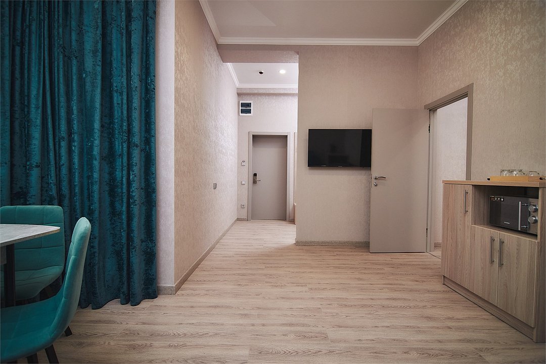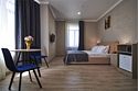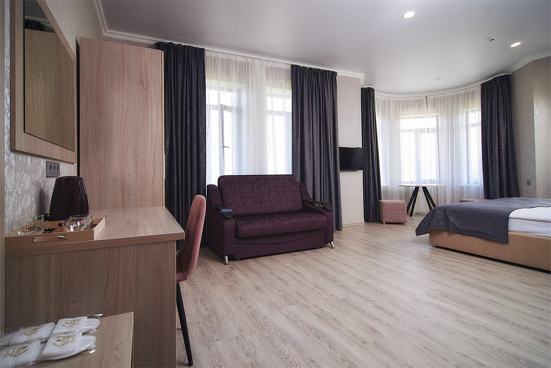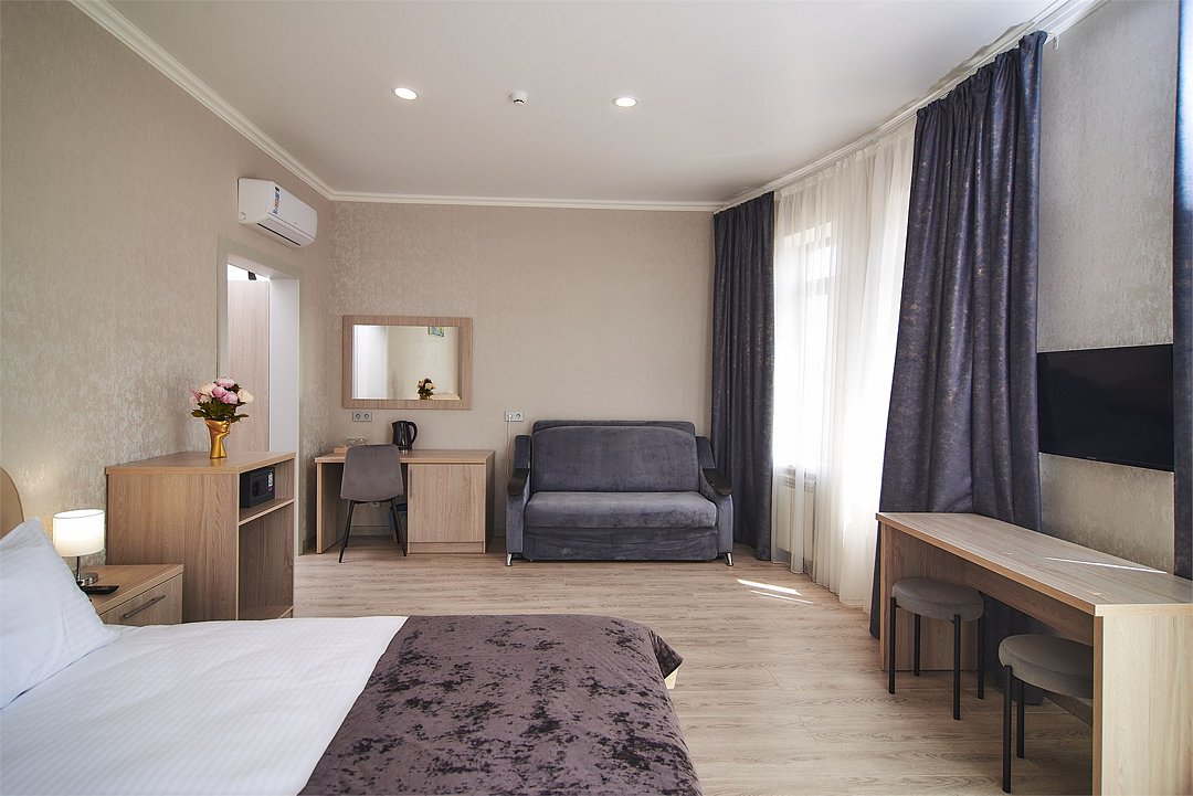 Однокомнатный номера вместимостью до четырех человек общей площадью от 28 до 30 м² отвечает всем современным требованиям комфорта и отдыха, оборудован индивидуальной системой кондиционирования, кроватью размера «King Size» с ортопедическим матрасом и мягким изголовьем, столом со стульями и пуфиками, сейфом, принадлежностями для приготовления чая, холодильником, телевизором с плоским экраном и смарт TV, звуконепроницаемыми окнами. В вашем распоряжении ванная комната с душевой кабиной, туалетом, гигиенический душем, феном, полотенцами и косметическим принадлежностями. К услугам гостей ежедневная уборка номеров. Уважаемые гости, всего 3 номера данной категории снабжены балконами, в связи с этим отель не может давать гарантию заселения именно в такой номер.Услуги и удобства