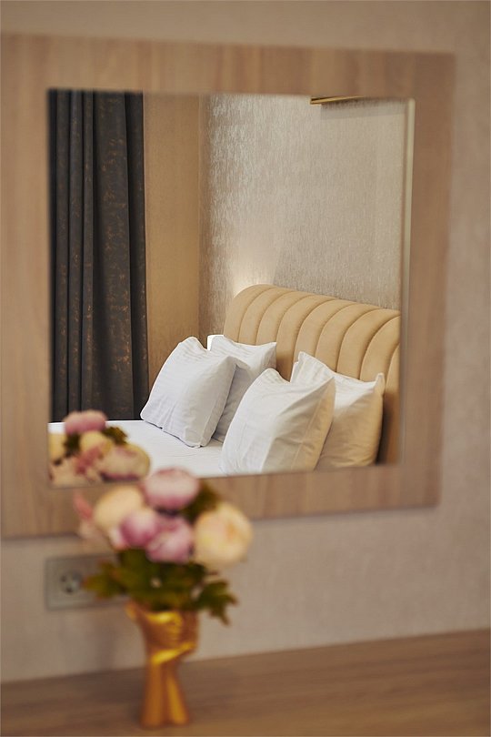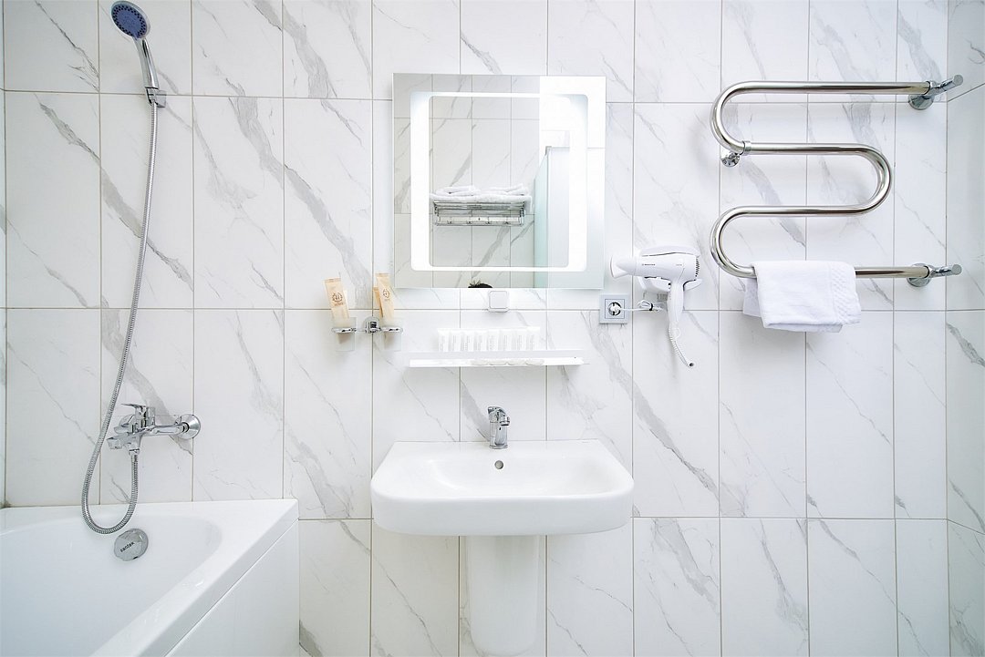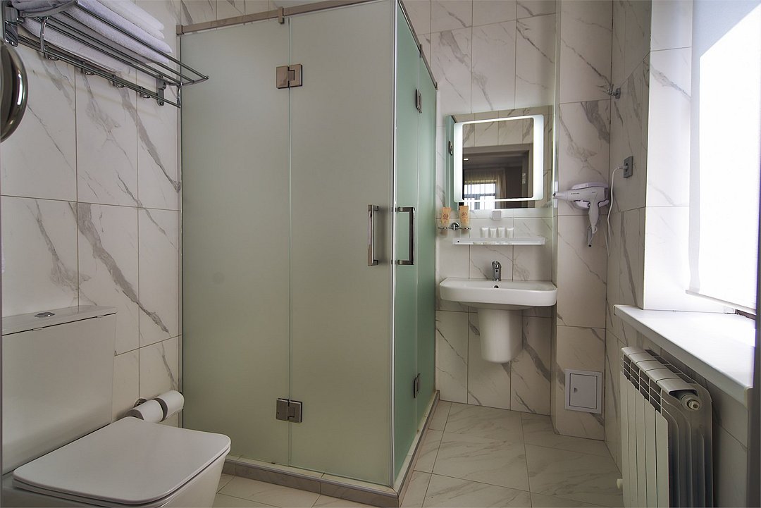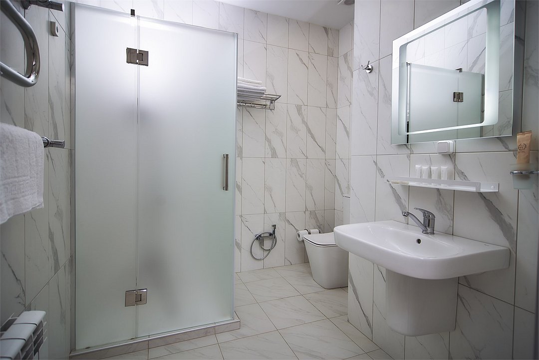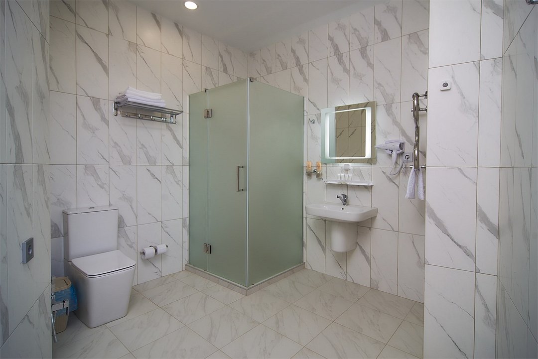 Двухместный номер общей площадью от 18 до 22 м² отвечает всем современным требованиям комфорта и отдыха, оборудован индивидуальной системой кондиционирования, кроватью размера «King Size» с ортопедическим матрасом и мягким изголовьем, столом со стульями, сейфом, принадлежностями для приготовления чая, холодильником, телевизором с плоским экраном и смарт TV, звуконепроницаемыми окнами. В вашем распоряжении ванная комната с душевой кабиной, туалетом, гигиенический душем, феном, полотенцами и косметическим принадлежностями. К услугам гостей ежедневная уборка номеров.Услуги и удобства