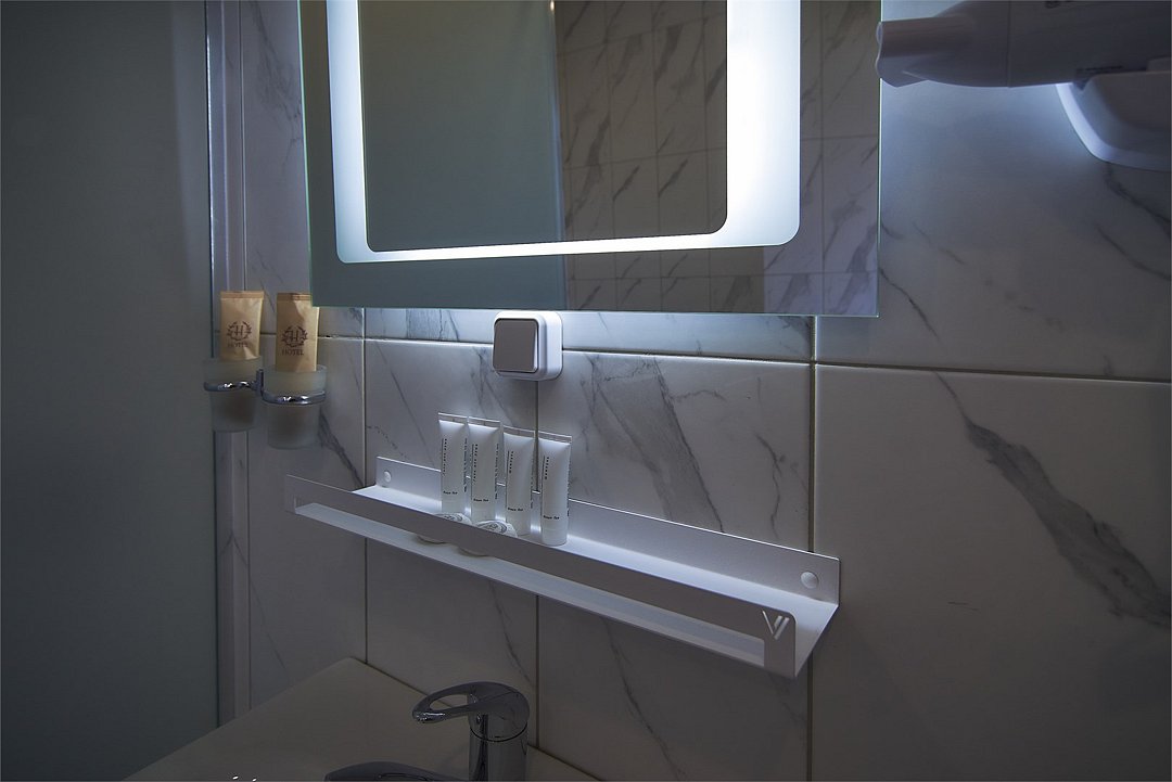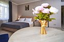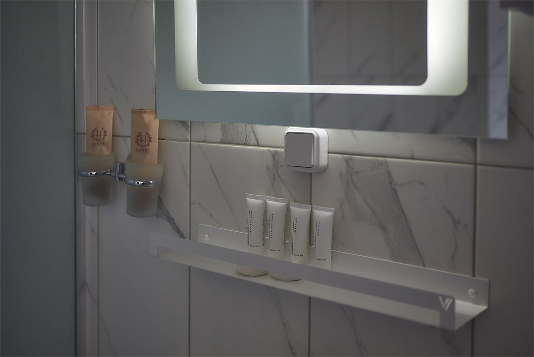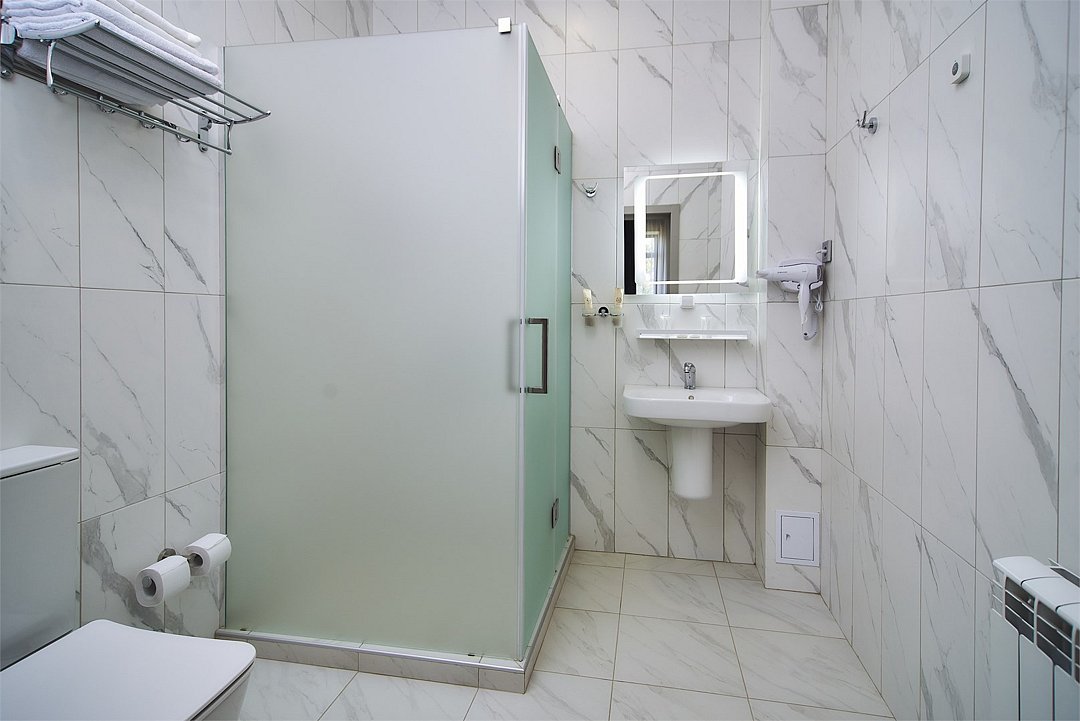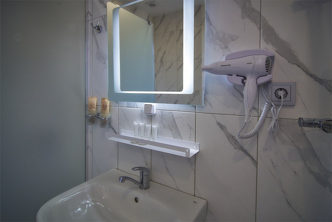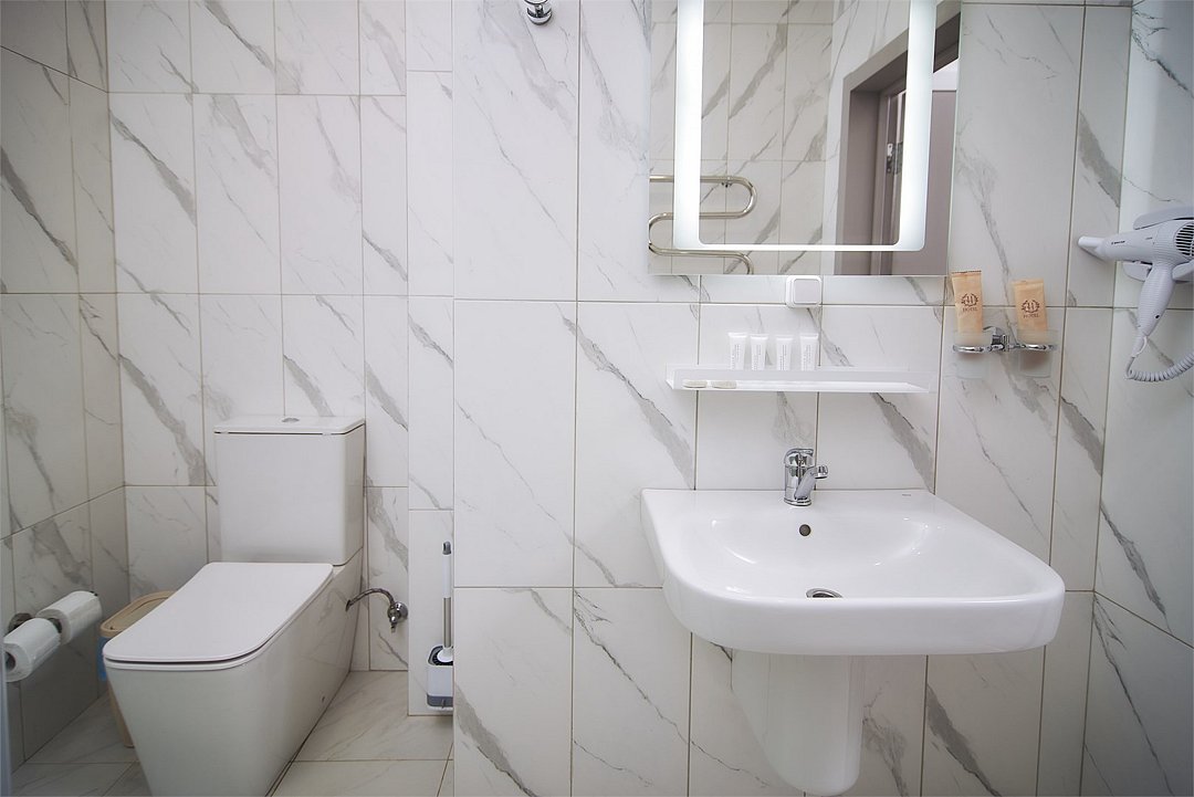 Двухместный номер общей площадью от 18 до 22 м² отвечает всем современным требованиям комфорта и отдыха, оборудован индивидуальной системой кондиционирования, кроватью размера «King Size» с ортопедическим матрасом и мягким изголовьем, столом со стульями, сейфом, принадлежностями для приготовления чая, холодильником, телевизором с плоским экраном и смарт TV, звуконепроницаемыми окнами. В вашем распоряжении ванная комната с душевой кабиной, туалетом, гигиенический душем, феном, полотенцами и косметическим принадлежностями. К услугам гостей ежедневная уборка номеров.Услуги и удобства