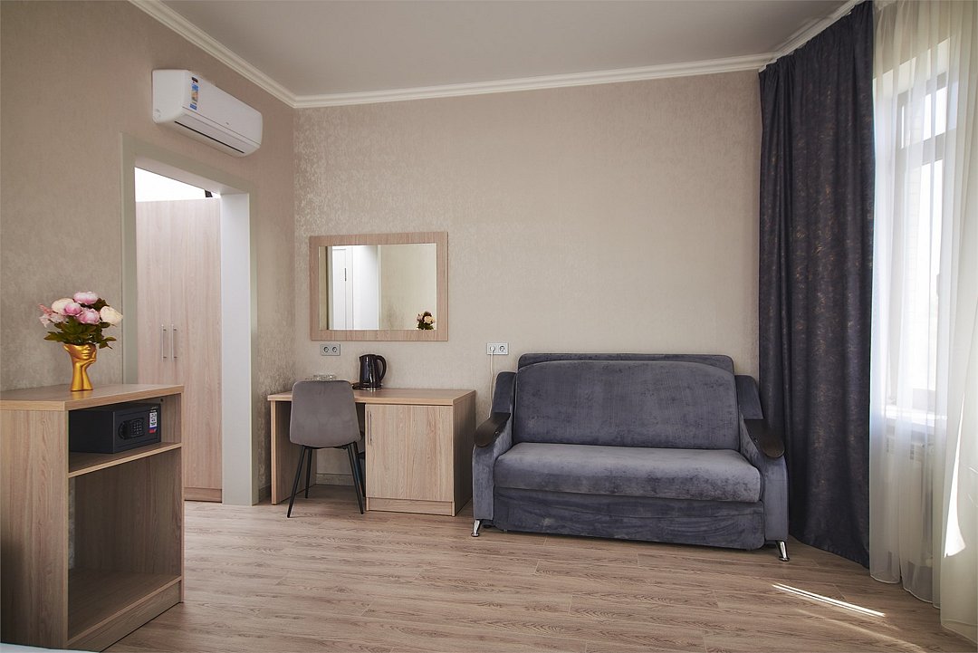 Номер категории Джуниор Сюит,, вместимостью до четырех человек, общей площадью от 36 до 40 м² отвечает всем современным требованиям комфорта и отдыха, оборудован индивидуальной системой кондиционирования, кроватью размера «King Size» с ортопедическим матрасом и мягким изголовьем, раскладным большим диваном, столом со стульями и пуфиками, сейфом, принадлежностями для приготовления чая, холодильником, телевизором с плоским экраном и смарт TV, звуконепроницаемыми окнами. В вашем распоряжении ванная комната с душевой кабиной, туалетом, гигиенический душем, феном, полотенцами и косметическим принадлежностями. К услугам гостей ежедневная уборка номеров.Услуги и удобства
