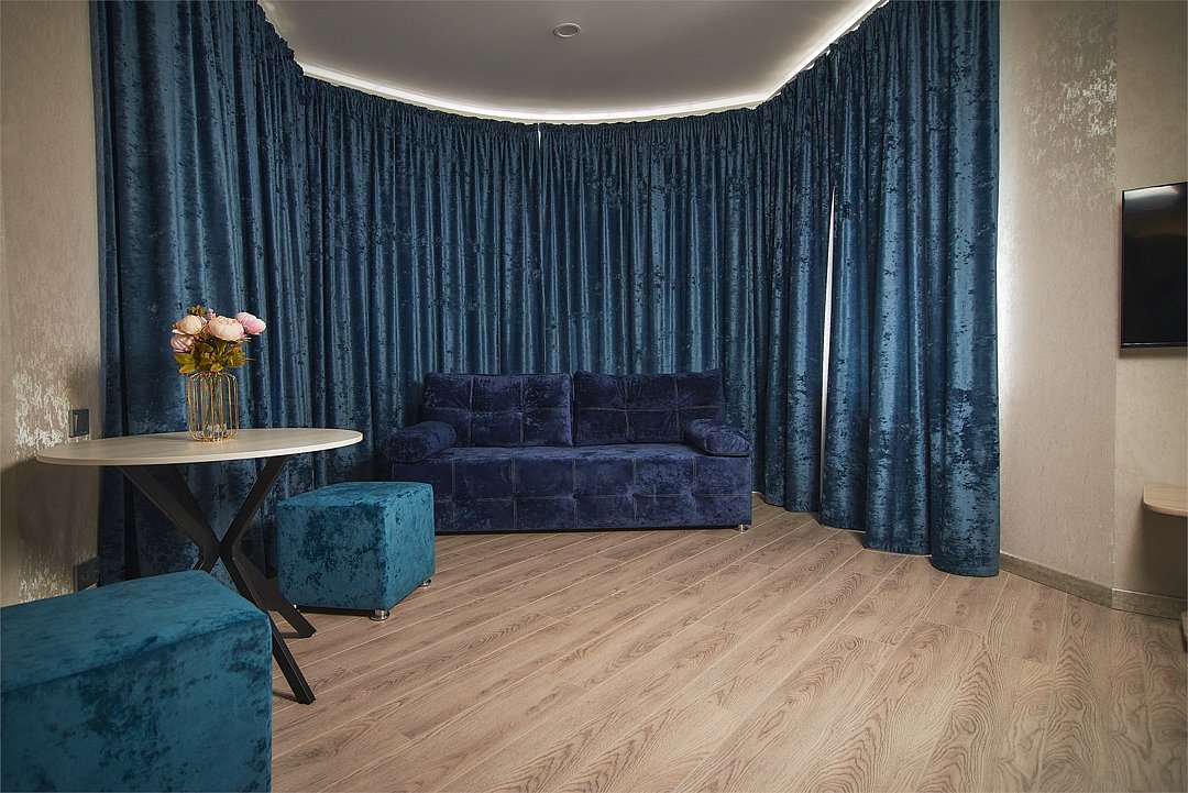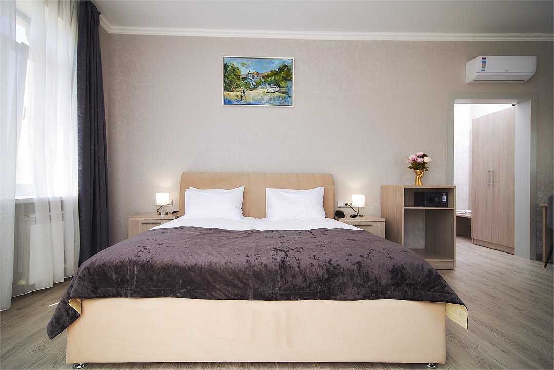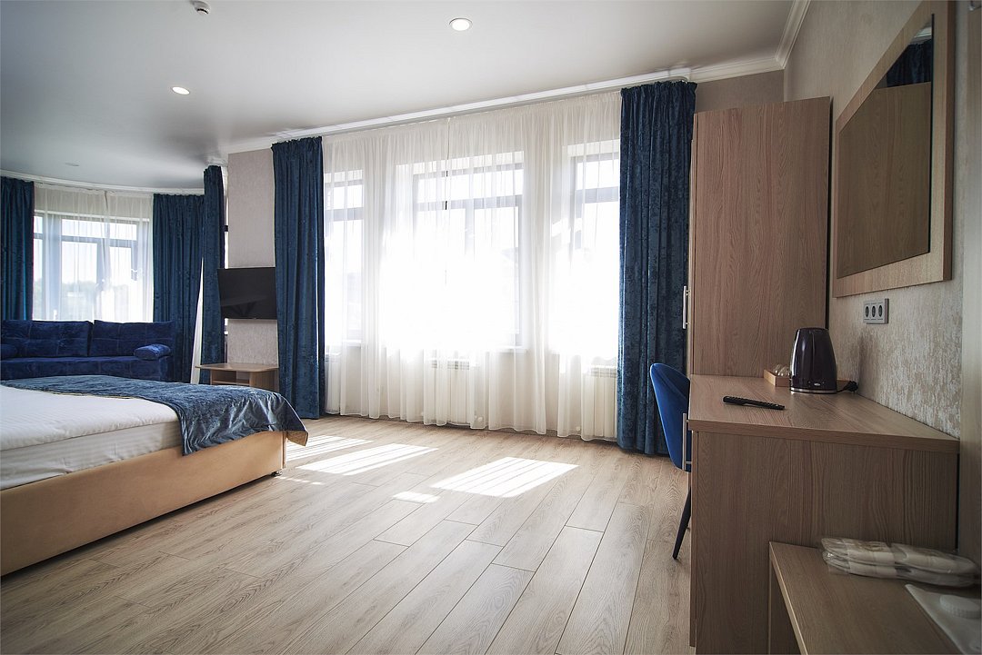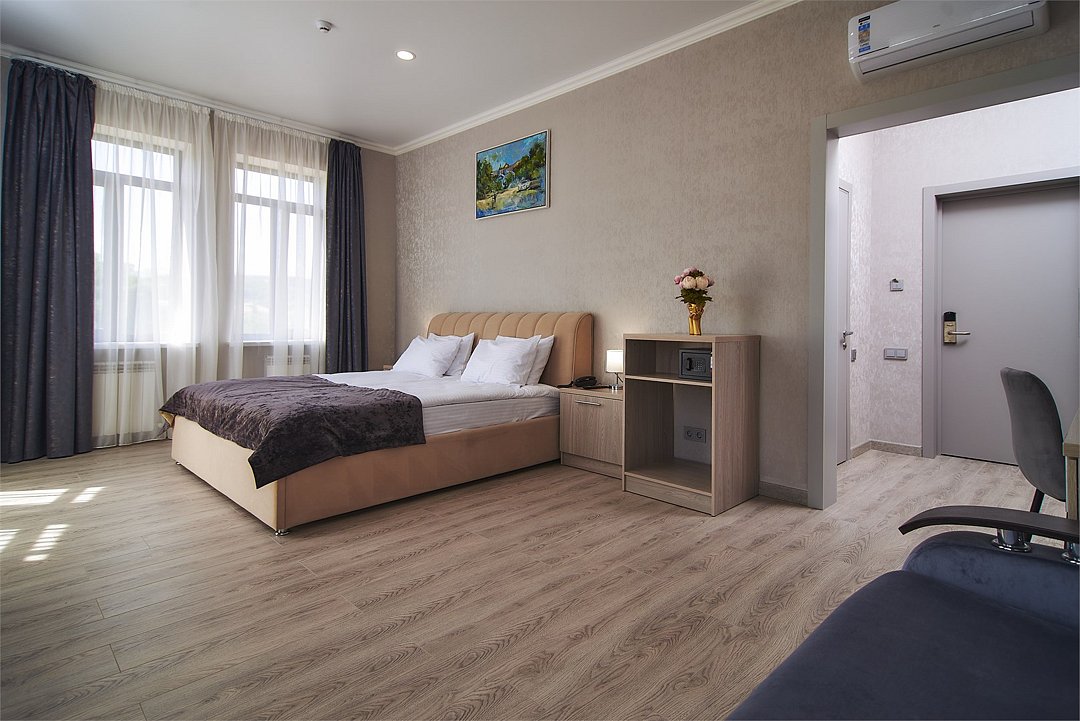 Люксовый двухкомнатный номер, вместимостью до четырех человек, общей площадью от 44 м² отвечает всем современным требованиям комфорта и отдыха, оборудован индивидуальной системой кондиционирования, кроватью размера «King Size» с ортопедическим матрасом и мягким изголовьем, раскладным большим диваном, обеденным столом со стульями и пуфиками, сейфом, принадлежностями для приготовления чая, холодильником, микроволновой печкой, телевизором с плоским экраном и смарт TV, звуконепроницаемыми окнами. В вашем распоряжении ванная комната с душевой кабиной и дополнительно ванной, туалетом, гигиеническим душем, феном, полотенцами и косметическим принадлежностями.Услуги и удобства