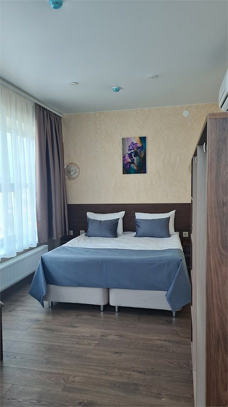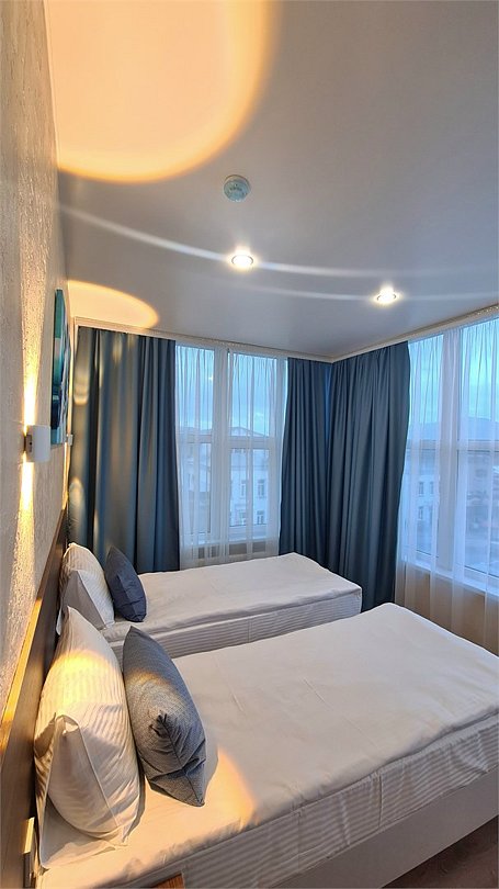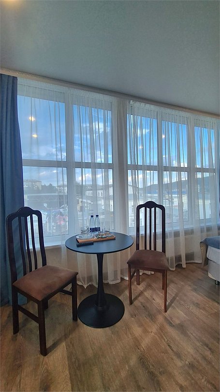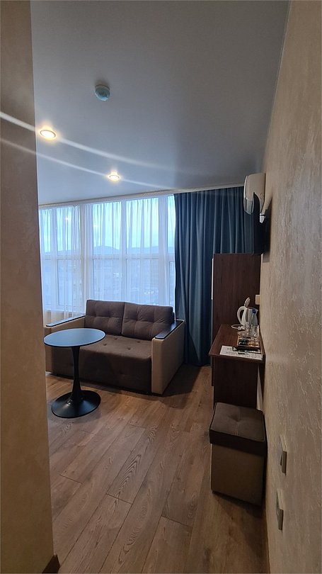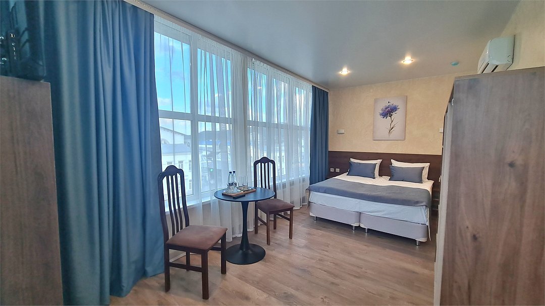 В номере вы найдёте всё необходимое для комфортного пребывания. Спальную зону, шкаф, тв. Уютная зона отдыха расположена у окон, она включает небольшой круглый столик и два стула. Вы можете насладиться горячим напитком в вашем номере оценив завораживающий панорамный вид на город. Блэкаут шторы обеспечат спокойный сон за счет блокирования внешнего света.Услуги и удобства