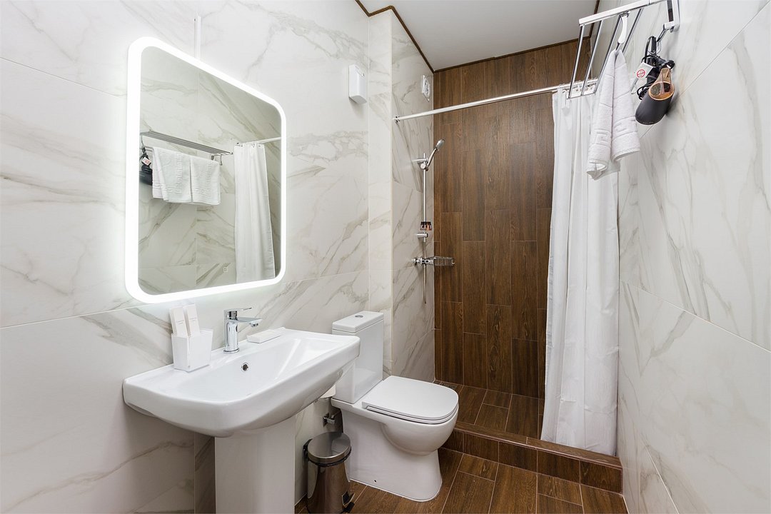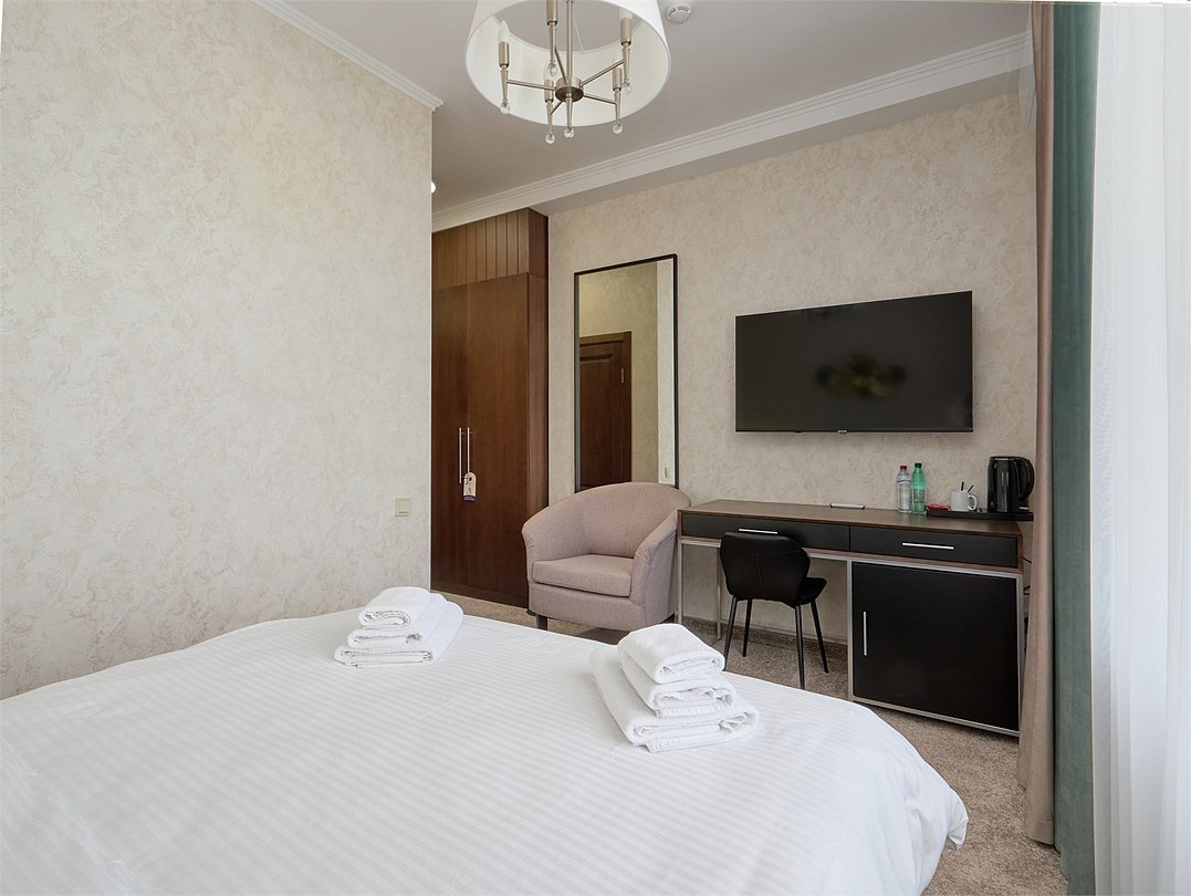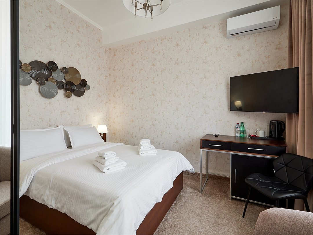 Уютный однокомнатный номер площадью 25 кв.м. Номер оснащен двухспальной кроватью 160 х 200 с ортопедическим матрасом и диваном.Услуги и удобства