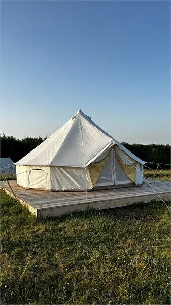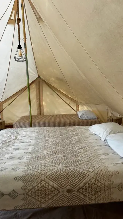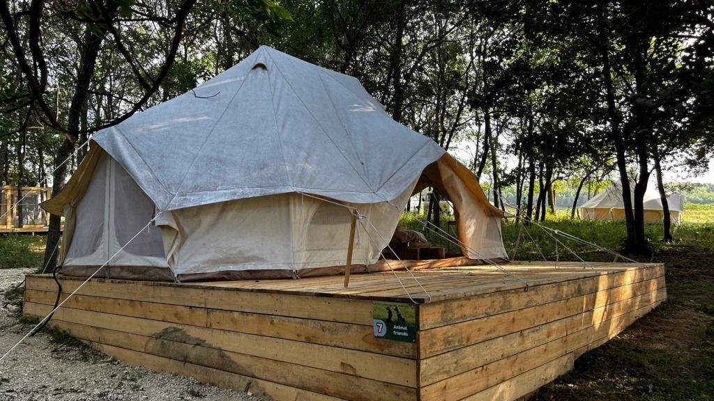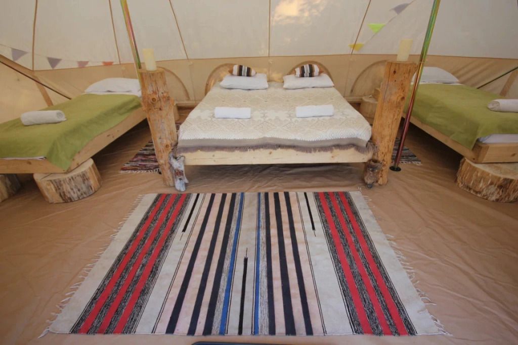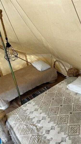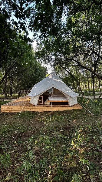 В тент-хаусе одна двуспальная кровать.Размещение с животными запрещено. Сан.узлы и душевые находятся на общей зоне для гостей