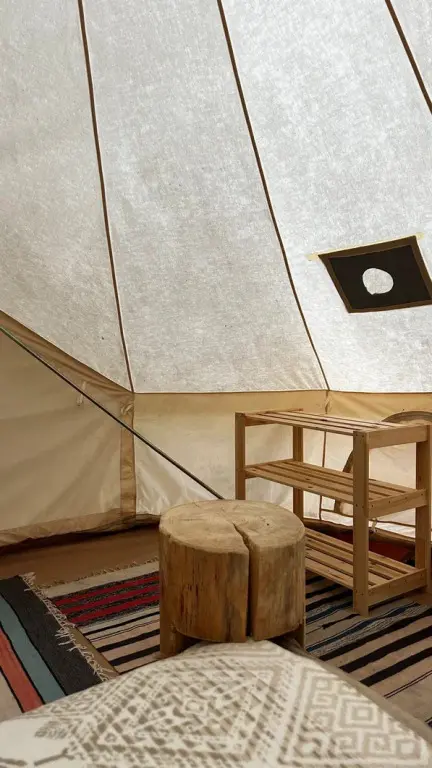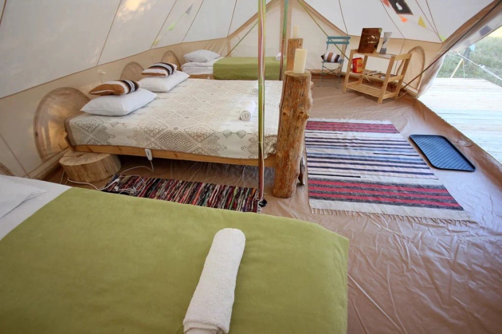 В тент-хаусе одна двуспальная кровать, дополнительное спальное место, стол, два стула и два уютных шезлонга в зоне отдыха. Подходит для размещения втроём, можно с животными.