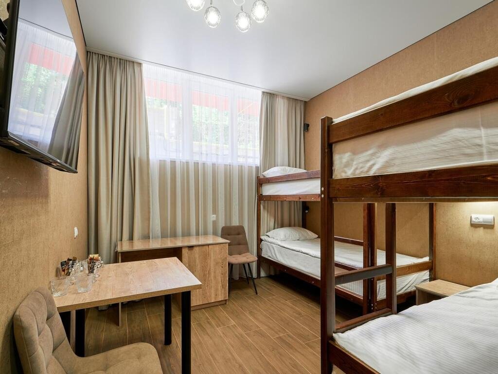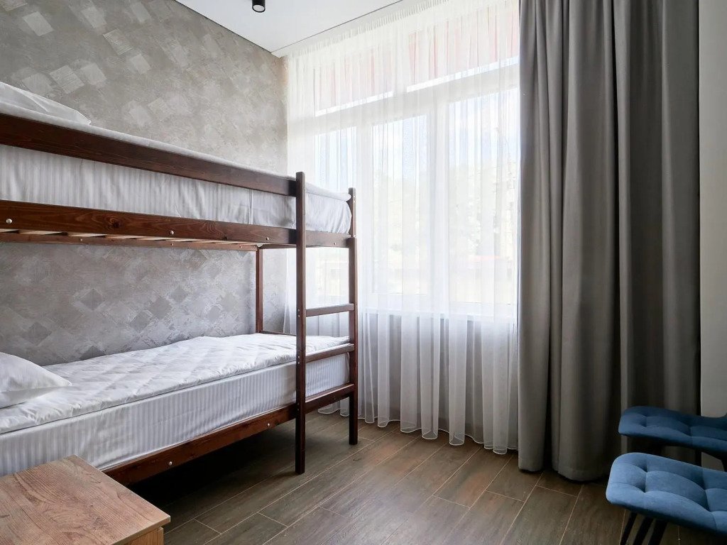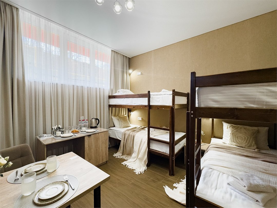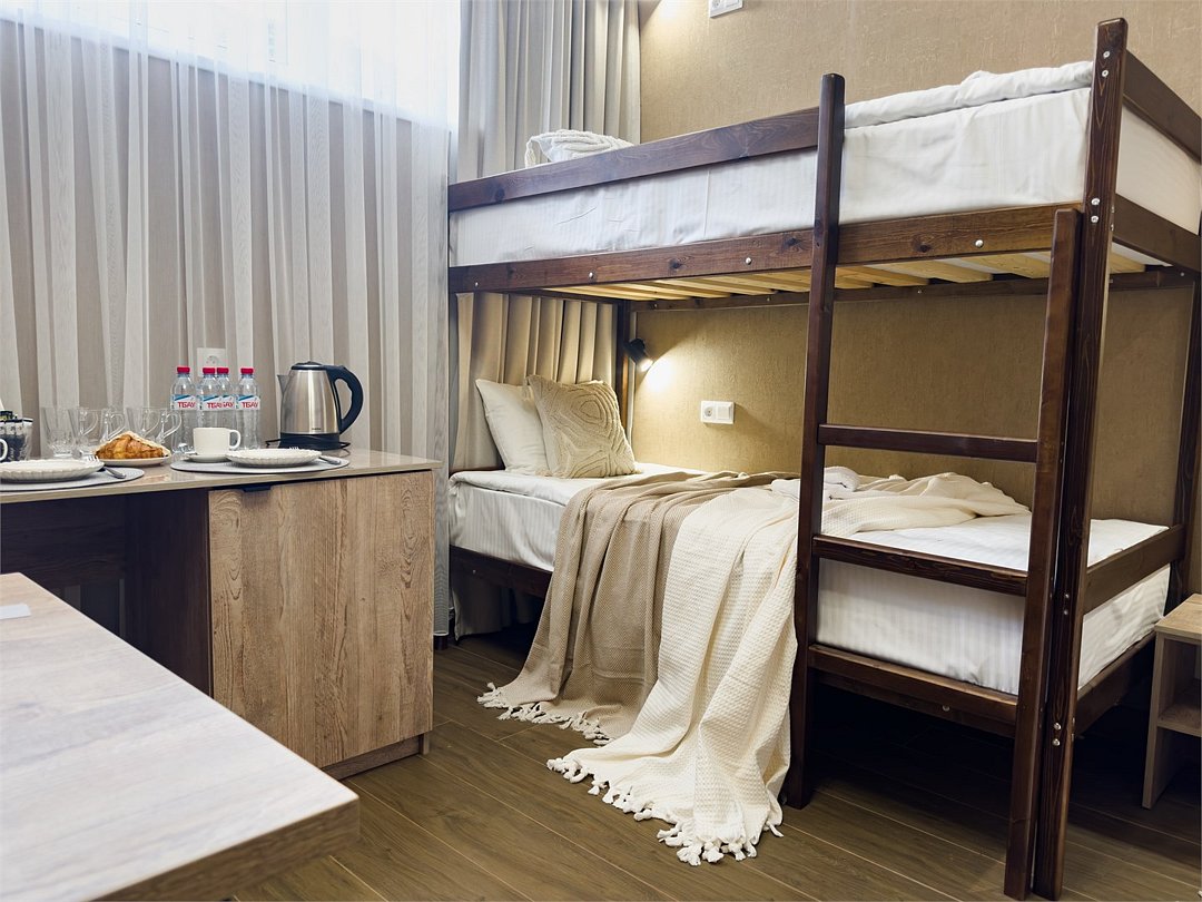 Комфортный номер площадью 20 квадратных метров, идеально подходящий для семейного отдыха или группового размещения. В номере располагаются две двухярусные кровати, выполненные в современном стиле, которые обеспечивают удобство и безопасность для всех гостей. Каждая кровать оснащена качественным матрасом и постельным бельем, что гарантирует полноценный отдых. Интерьер номера выполнен в светлых тонах, с акцентами на яркие детали, создающие атмосферу уюта и спокойствия. В номере также есть удобная зона для отдыха с небольшим столиком и стульями, где вы сможете насладиться чашечкой кофе или поработать за ноутбуком. Ванная комната оснащена душевой кабиной, умывальником и туалетом, набором всех необходимых гигиенических принадлежностей. Этот номер предлагает уникальное сочетание современного дизайна, практичности и комфорта, делая ваше пребывание в отеле незабываемым!Услуги и удобства