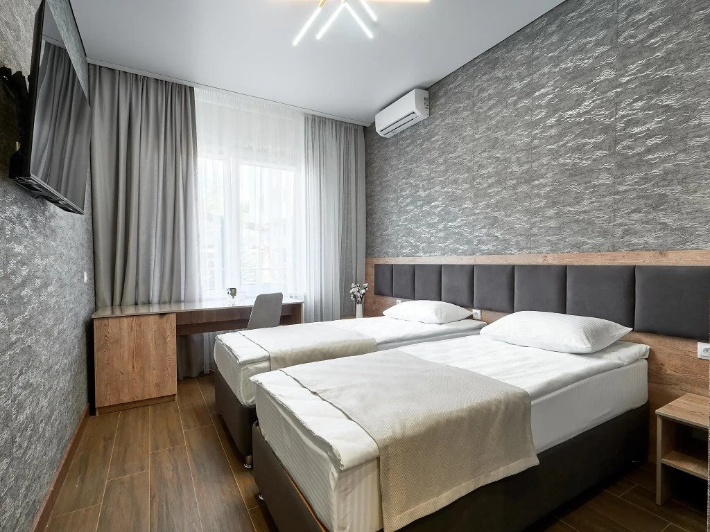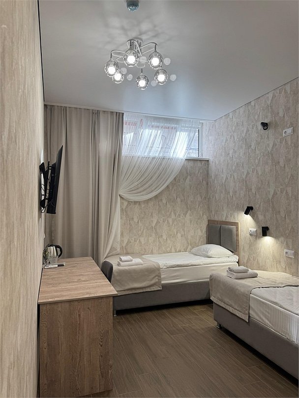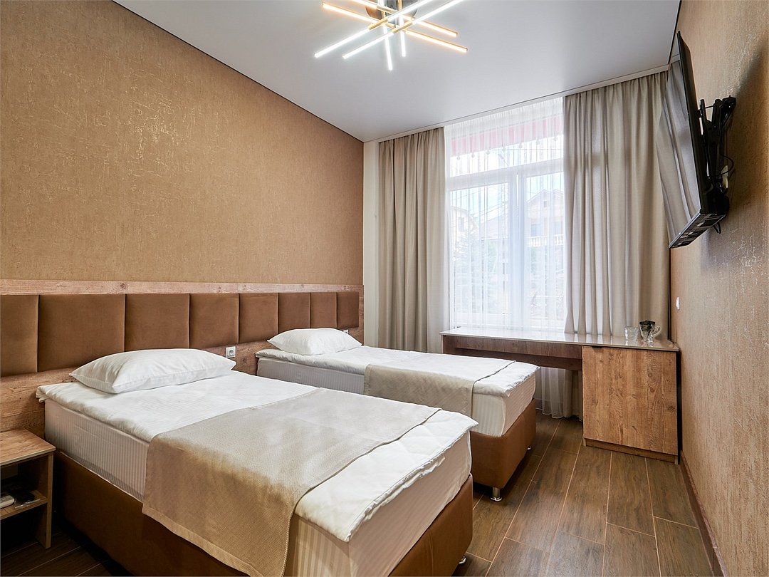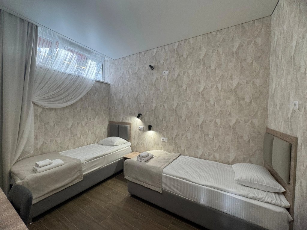 Комфортный двухместный номер площадью 20 квадратных метров. В номере располагаются две односпальные кровати, выполненные в современном стиле, которые обеспечивают удобство и безопасность для всех гостей. Каждая кровать оснащена качественным матрасом и постельным бельем, что гарантирует полноценный отдых. Интерьер номера выполнен в светлых тонах, с акцентами на яркие детали, создающие атмосферу уюта и спокойствия. В номере также есть удобная зона для отдыха с небольшим столиком и стульями, где вы сможете насладиться чашечкой кофе или поработать за ноутбуком. Ванная комната оснащена душевой кабиной, умывальником и туалетом, набором всех необходимых гигиенических принадлежностей. Этот номер предлагает уникальное сочетание современного дизайна, практичности и комфорта, делая ваше пребывание в отеле незабываемым!Услуги и удобства