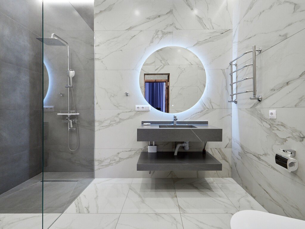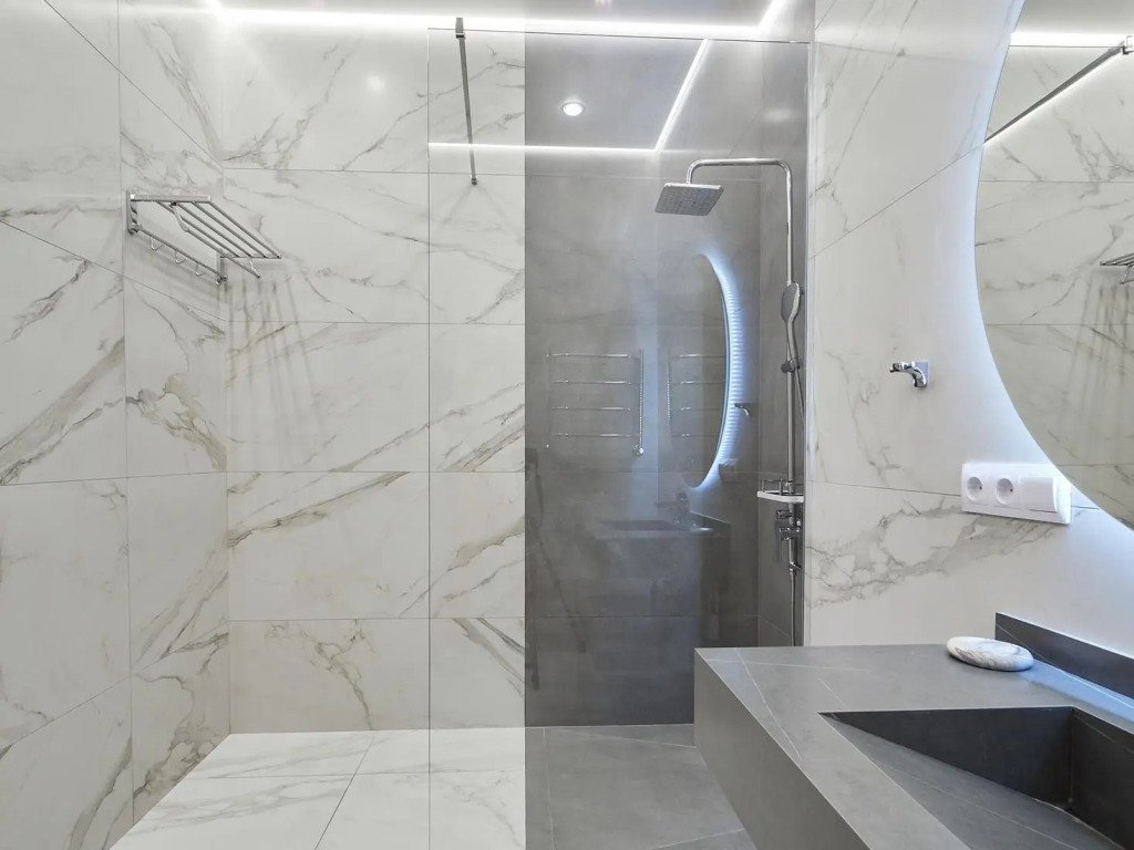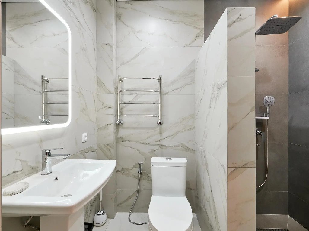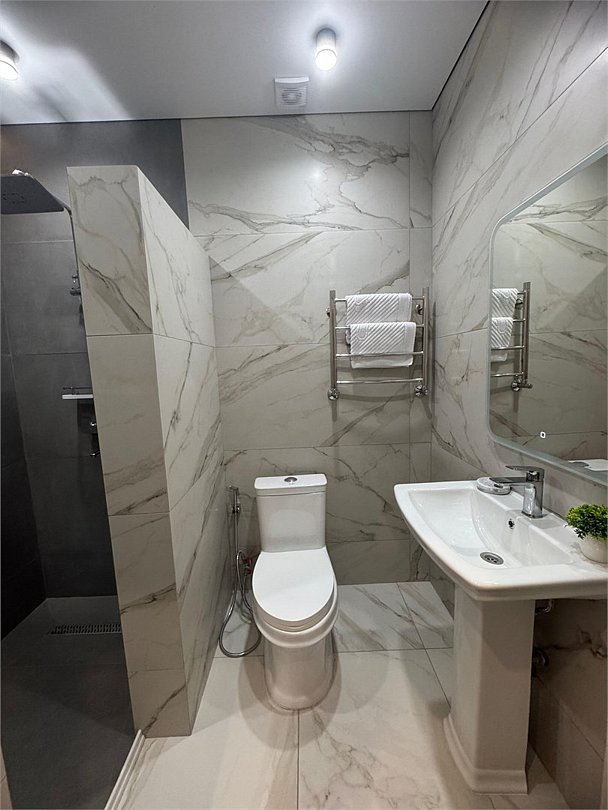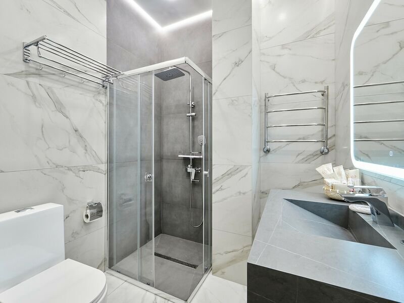 фен, душевая кабина, санузел, теплый пол, халаты, банные полотенца, тапочки, гигиенические средства, раковина, телевизор с плоским экраном, мини-холодильник, шапочка для душа, мылоВ номере