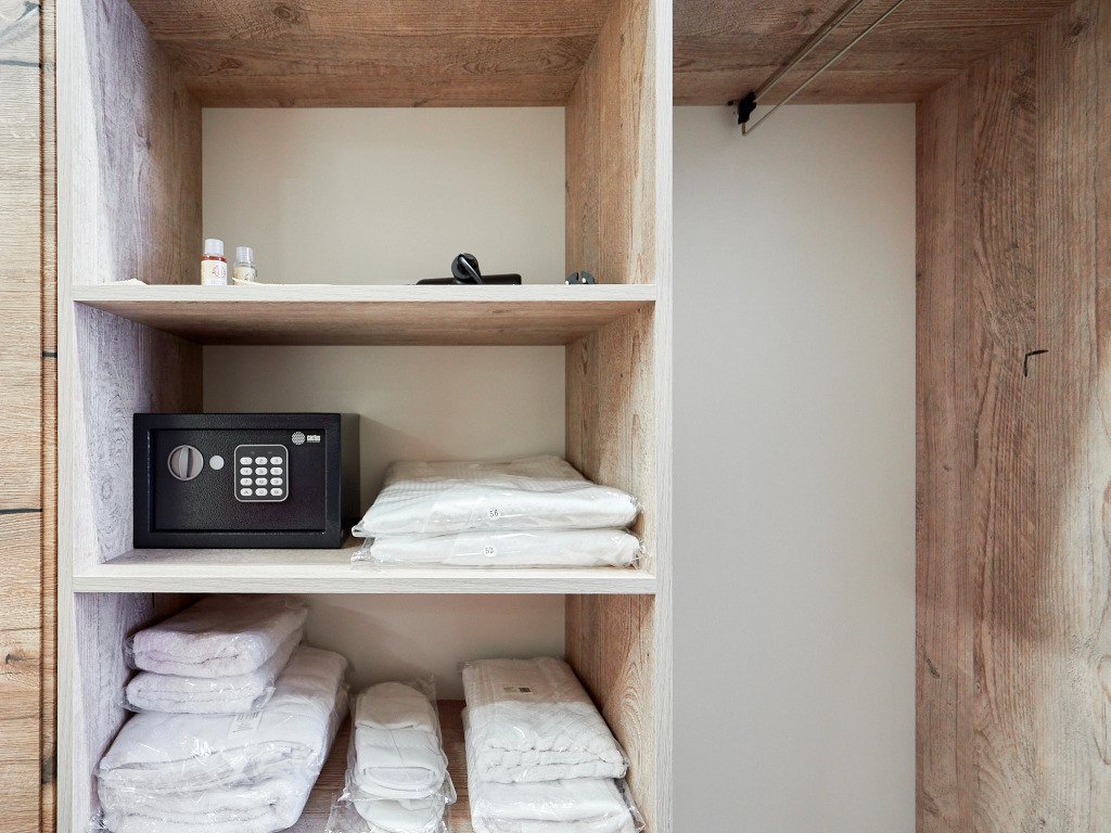 Wi-Fi, фен, душевая кабина, санузел, теплый пол, халаты, банные полотенца, тапочки, гигиенические средства, односпальная кровать, стулья, шкаф для одежды, вешалки, зеркало, чайный набор, чайник, раковина, ламинат, стаканы, стол, туалетные средства, телевизор с плоским экраном, мини-холодильник, теплые полы, двухъярусная кровать, бутилированная вода, шапочка для душа, затемняющая штораВ номере