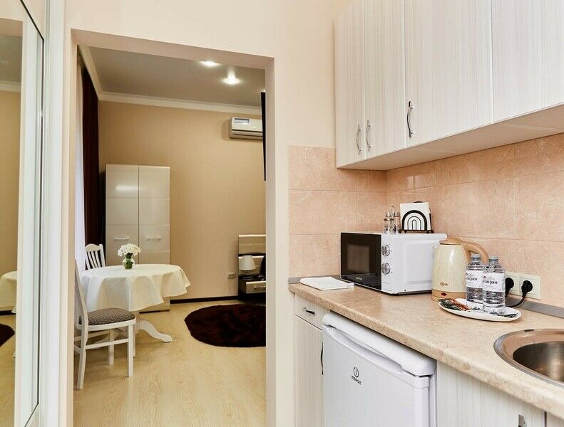 Двухэтажное здание расположено в тихом зеленом районе. Имеются двухместные и четырехместные номера с собственной мини-кухней, ванной комнатой с душем, кондиционером и необходимой бытовой техникой.