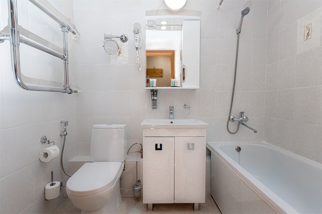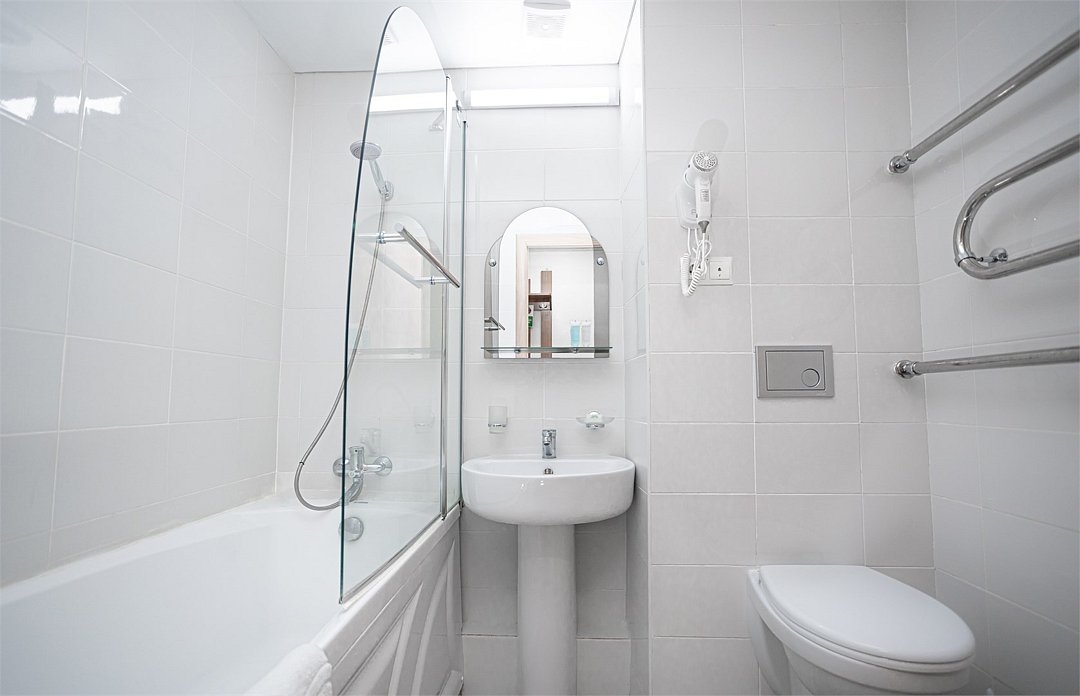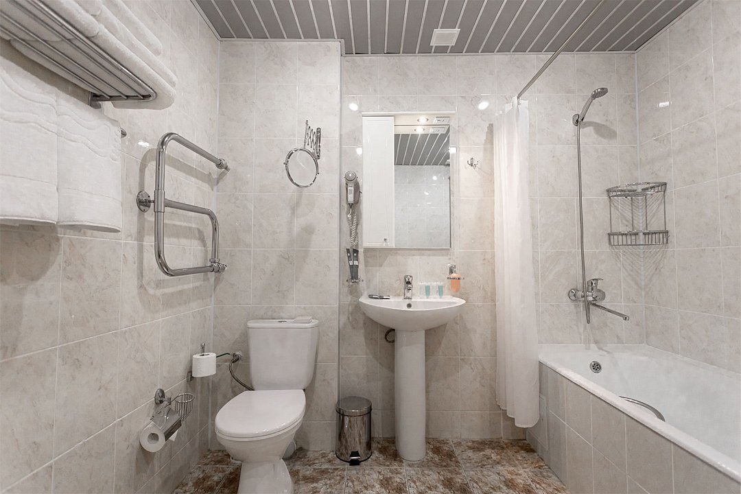 телевизор, холодильник, настольные лампы, фен, ванная комната, ванна, банные полотенца, гигиенические средства, косметические средства, балкон, полутораспальная кровать, кресла, стулья, шкаф для одежды, вешалки, журнальный столик, зеркало, унитаз, раковинаВ гостиничном номере