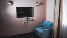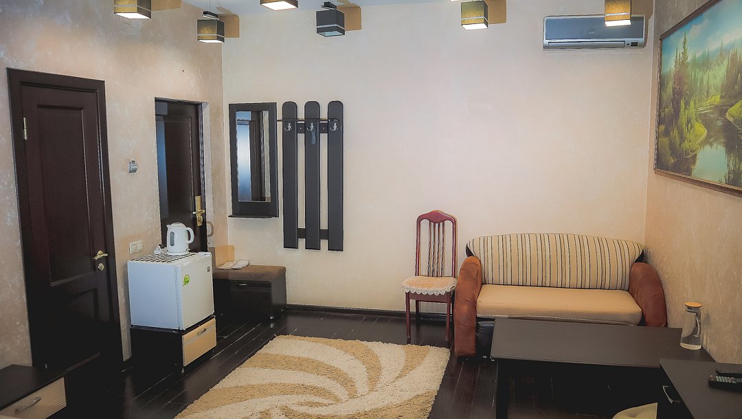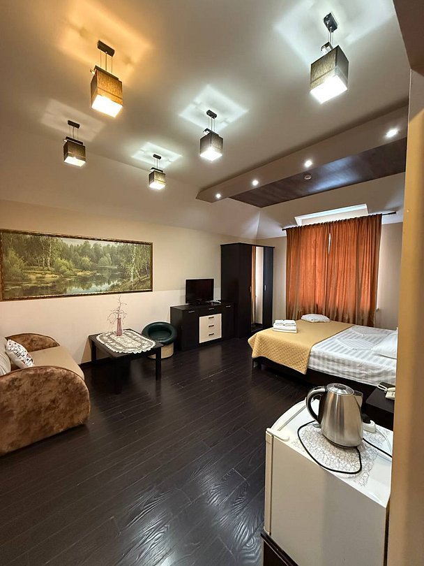 В номере есть холодильник, чайник, набор посуды, телевизор и собственный санузел. Для вашего комфорта предоставляются полотенца, халаты, тапочки и гигиенический набор.