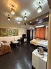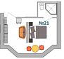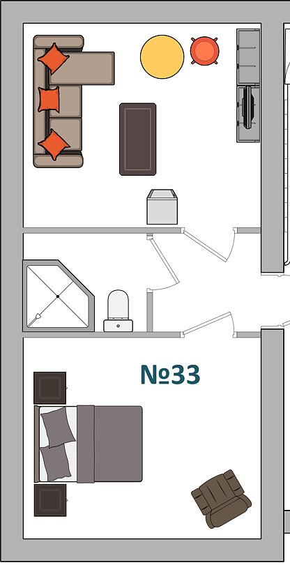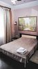 В спальне — двуспальная кровать, прикроватные тумбочки, шкаф и телевизор. В гостиной — двуспальный диван, журнальный столик, пуфик и шкаф для посуды.
