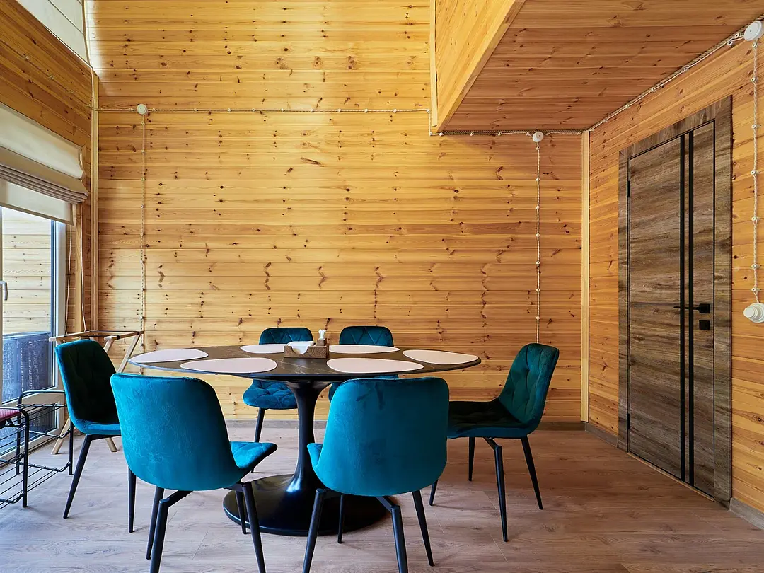 Домик — также со вторым светом, на 1 этаже — диван, коврик, круглый стол со стульями.