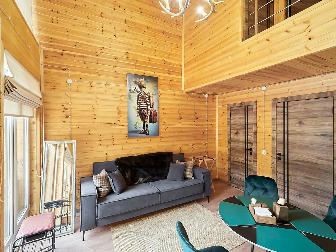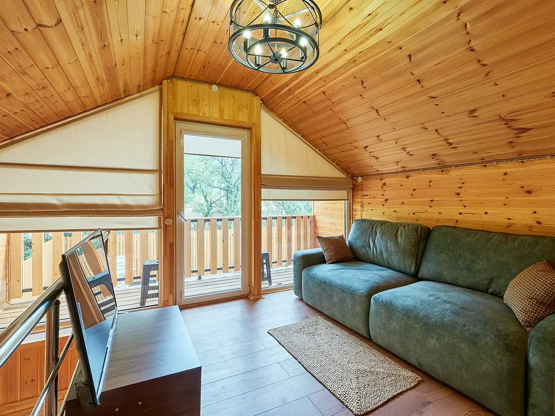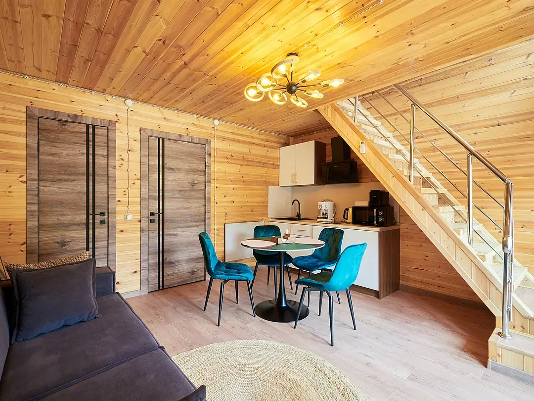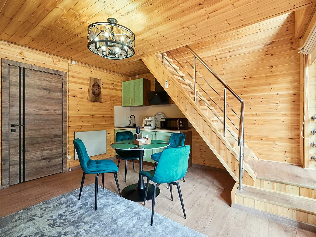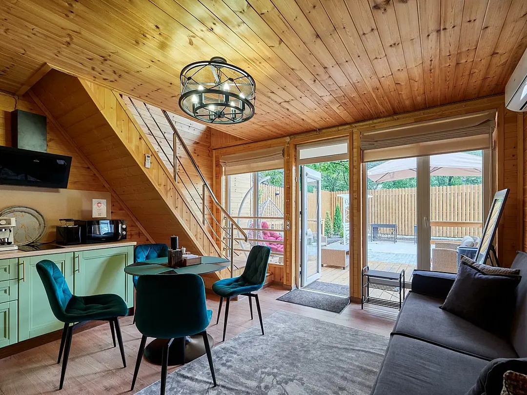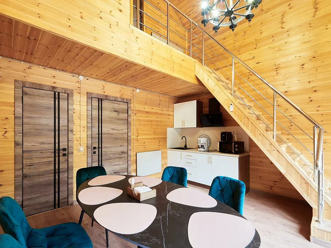 Домик — балкончик и на 2 этаже зона отдыха с диваном, телевизором и столиком. на 1 этаже есть кухонный гарнитур с вытяжкой, холодильник, индукционная печь, тостер, микроволновая печь, кофемашина, электрический чайник. Столовая посуда, приборы столовые, ложки, заварочный чайник, кастрюля и сковорода. На стене оригинальные картины.