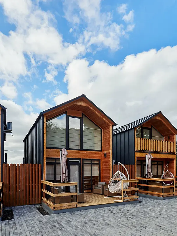 Каждый из домиков встретит Вас домашней атмосферой и предоставит всё необходимое для комфортного проживания: удобную мебель, оборудованный кухонный уголок, телевизор и зону отдыха на террасе. Стены украшены рукотворными картинами.