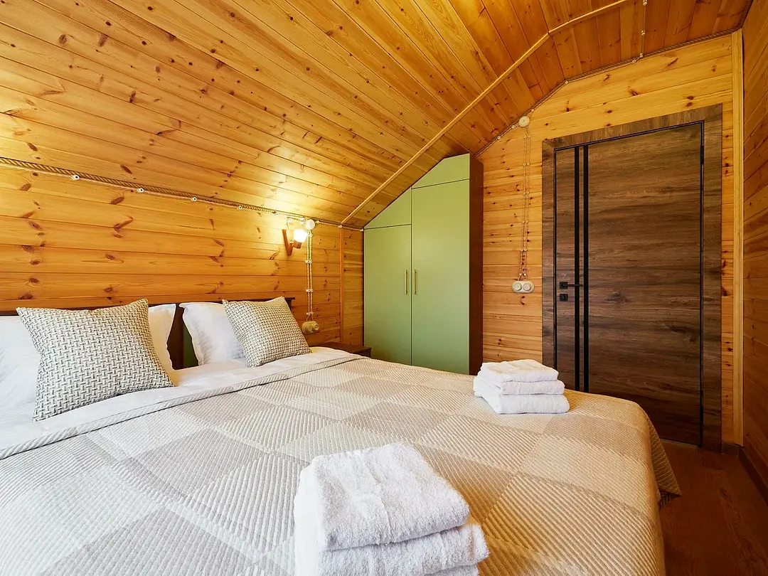 На 2 этаже имеется 2 спальни — одна спальня с кроватью односпальной, шкафом и прикроватной тумбочкой. Во второй спальне отличия — в 1 и 2 домиках стоят по две односпальные кровати, шкаф и 2 прикроватные тумбочки.