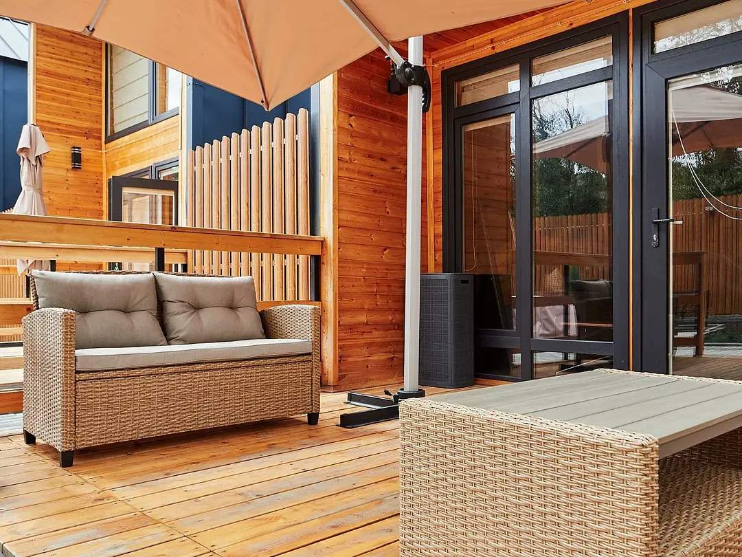 Домик — с открытым балконом, на 2 этаже две спальни и зона отдыха с двумя креслами и телевизором, столик .