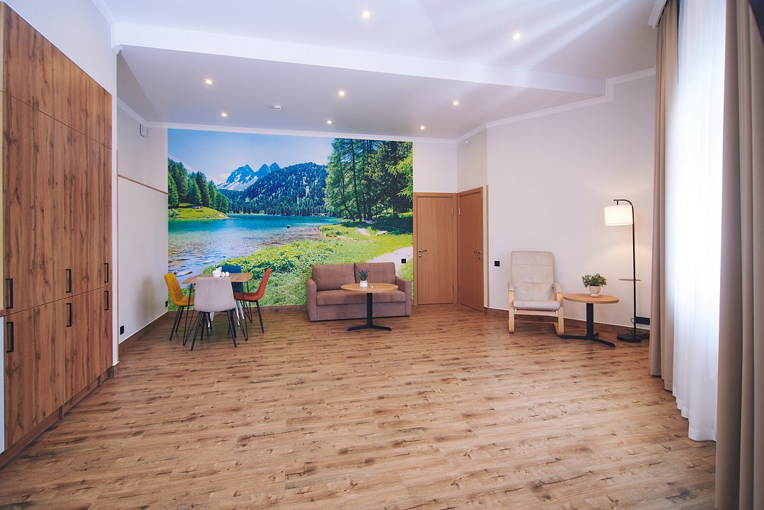 Трехэтажное здание гостевого дома разместилось в окружении рельефного ландшафта – ценителям природы придется это место по душе. Жилой фонд включает в себя комфортабельные апартаменты с кухней. Номера оснащены всем необходимым, начиная от электроплиты на кухне, и заканчивая феном в санузле. Современные интерьеры комнат оформлены в светлых тонах с добавлением ярких деталей.