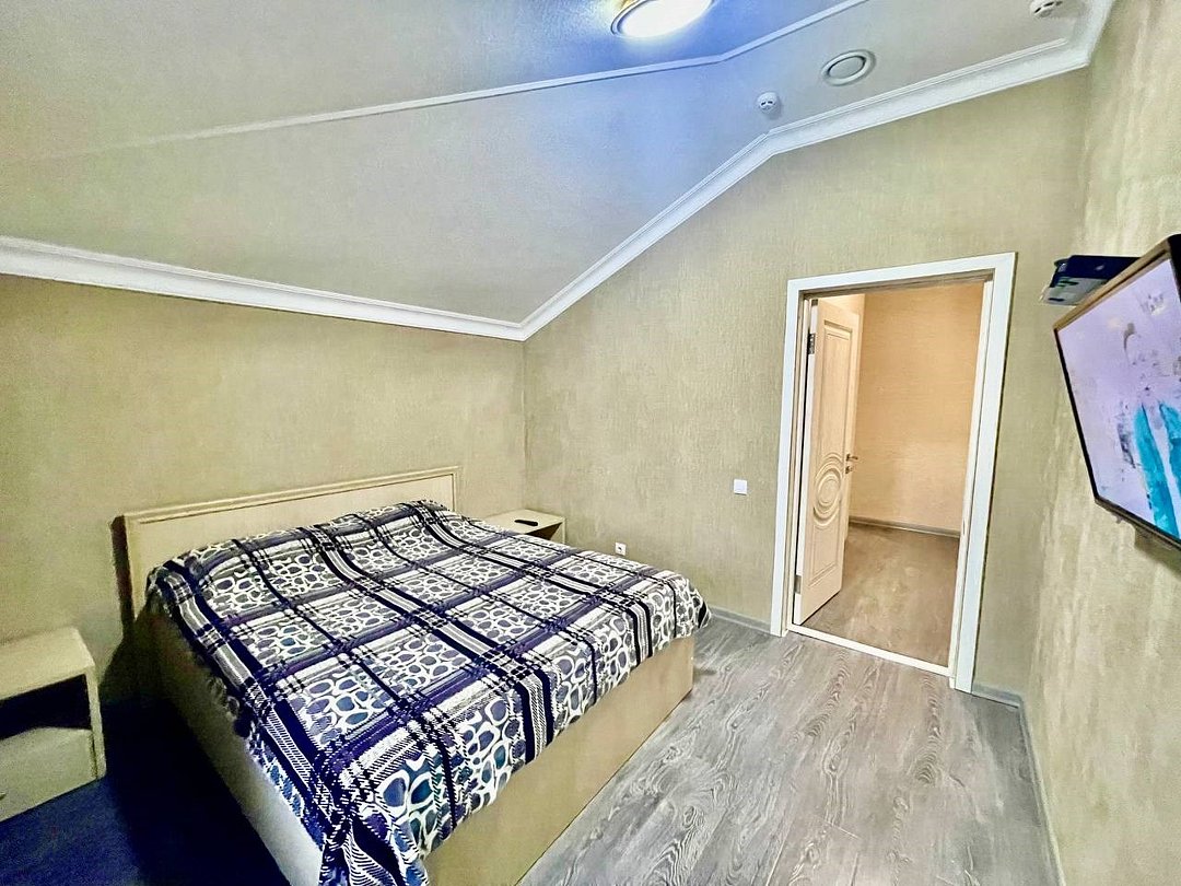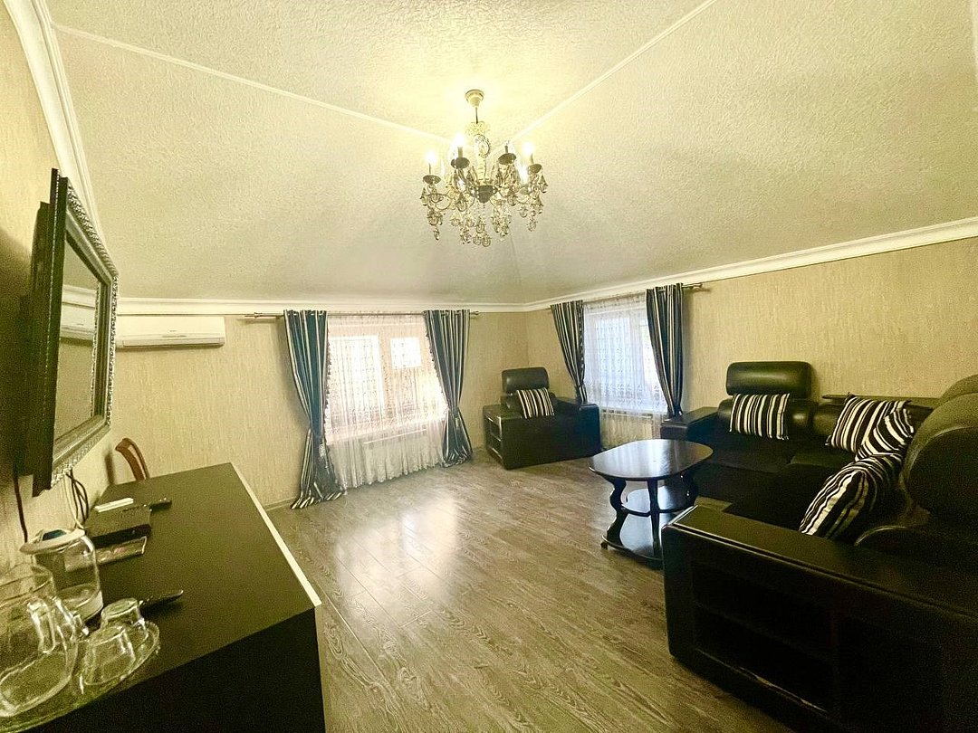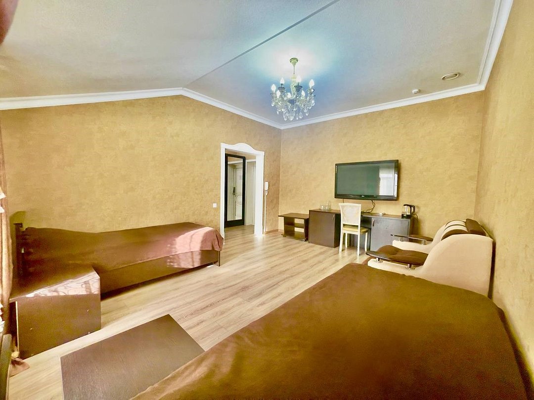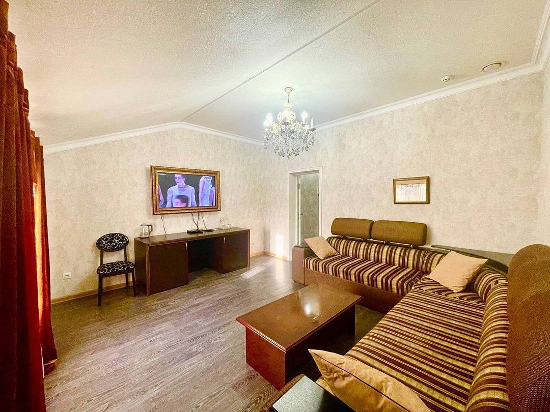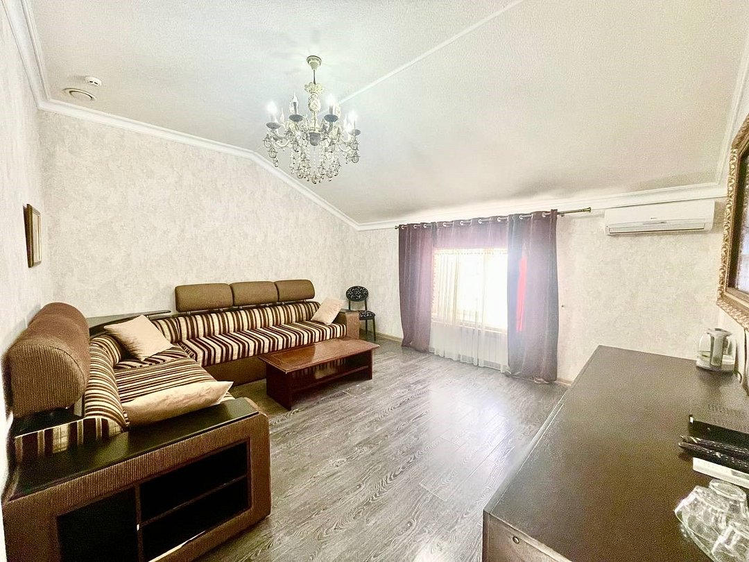 Уютный 2-комнатный номер "Люкс" рассчитан на проживание до 4 гостей. СПАЛЬНЫЕ МЕСТА: 2-спальная кровать и 2-спальный угловой диван (доп место) ДЕТИ: до 6-лет размещаются бесплатно без предоставления дополнительного места. ОСНАЩЕНИЕ НОМЕРА: ТВ SMART (приставка), кондиционер, эл. чайник, мини- холодильник с маленькой морозилкой, фен, сейф. САНУЗЕЛ: душ, раковина, туалет, базовые гигиенические средства: мыло, шампунь, гель для душа, зубной набор, тапочки, по 3 полотенца на гостя. В номере имеется окно с видом на город/парковку/двор. Уборка, смена белья/полотенец (1 раз в 3 дня/ по запросу).Услуги и удобства