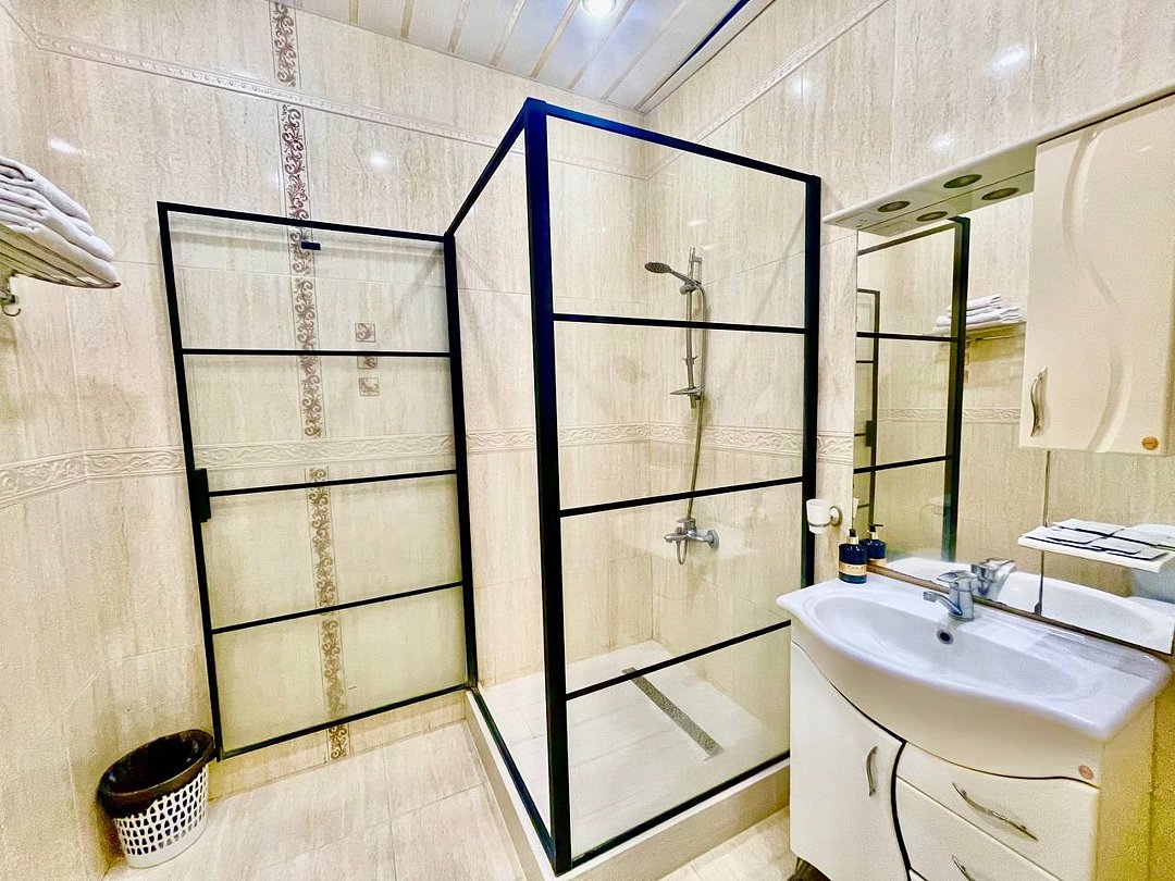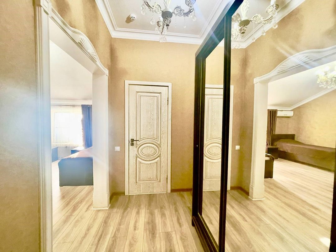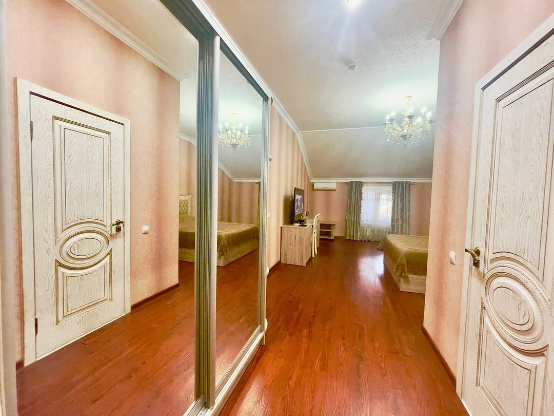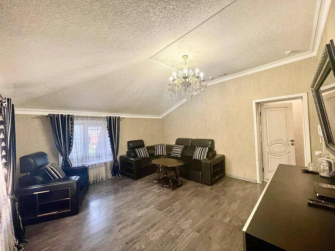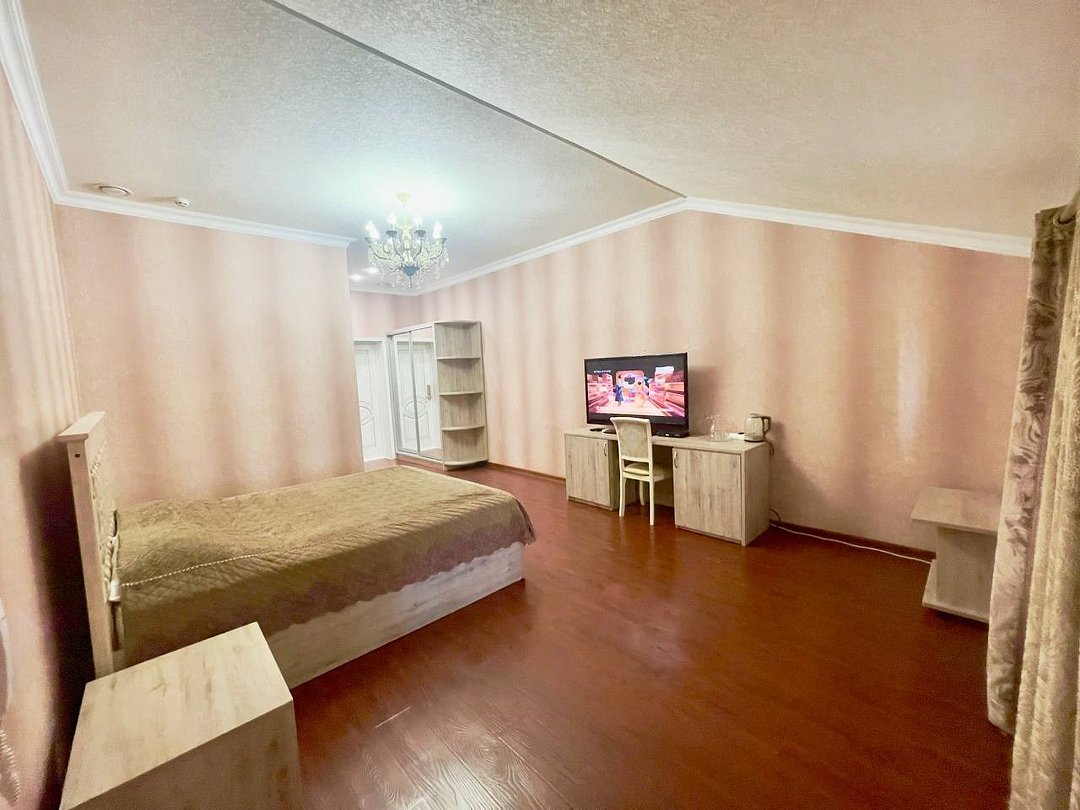 Уютный 2-комнатный номер "Люкс" рассчитан на проживание до 4 гостей. СПАЛЬНЫЕ МЕСТА: 2-спальная кровать и 2-спальный угловой диван (доп место) ДЕТИ: до 6-лет размещаются бесплатно без предоставления дополнительного места. ОСНАЩЕНИЕ НОМЕРА: ТВ SMART (приставка), кондиционер, эл. чайник, мини- холодильник с маленькой морозилкой, фен, сейф. САНУЗЕЛ: душ, раковина, туалет, базовые гигиенические средства: мыло, шампунь, гель для душа, зубной набор, тапочки, по 3 полотенца на гостя. В номере имеется окно с видом на город/парковку/двор. Уборка, смена белья/полотенец (1 раз в 3 дня/ по запросу).Услуги и удобства