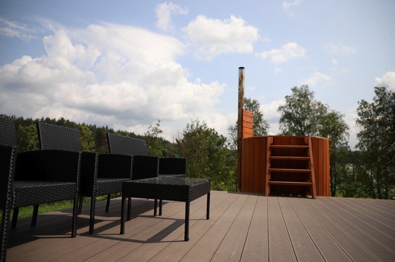 Чан на дровах на террасе, вместимостью до 8 человек и великолепным видом.