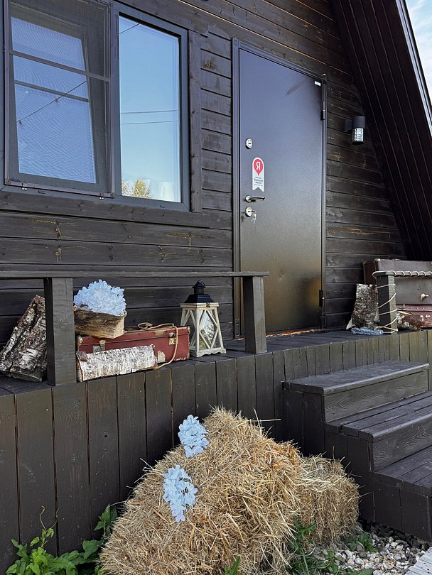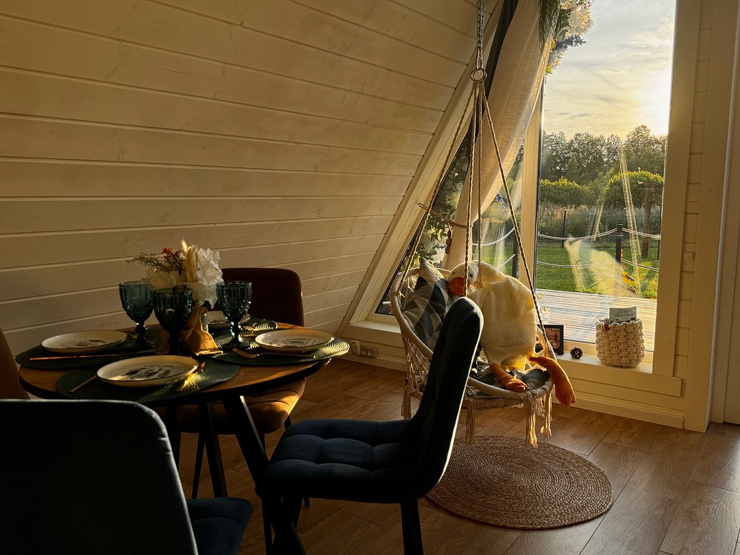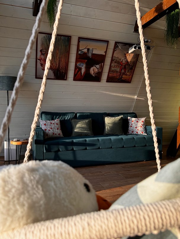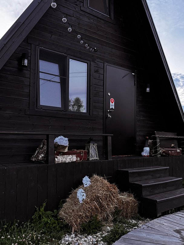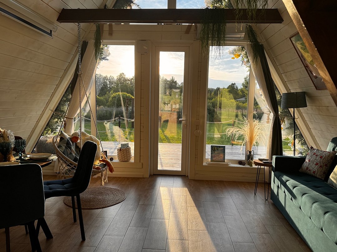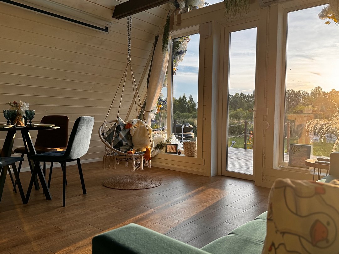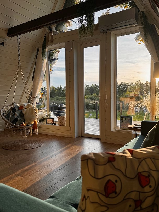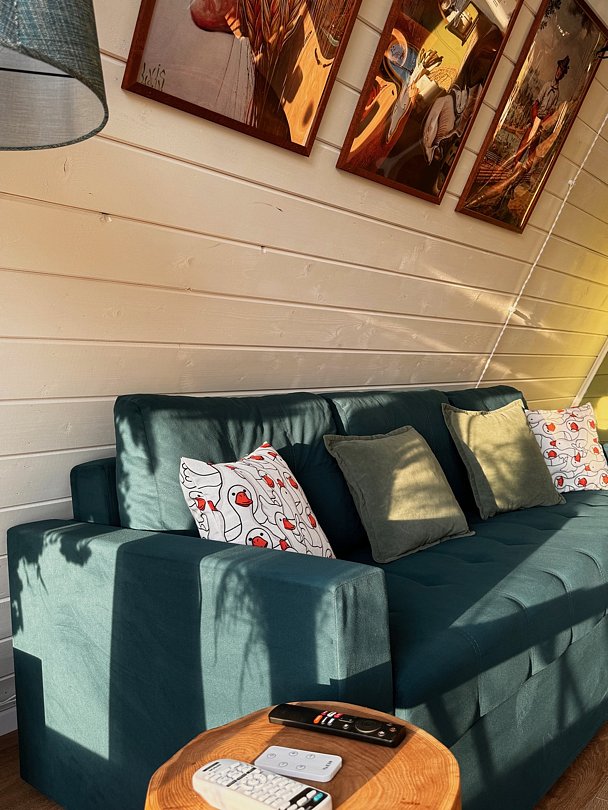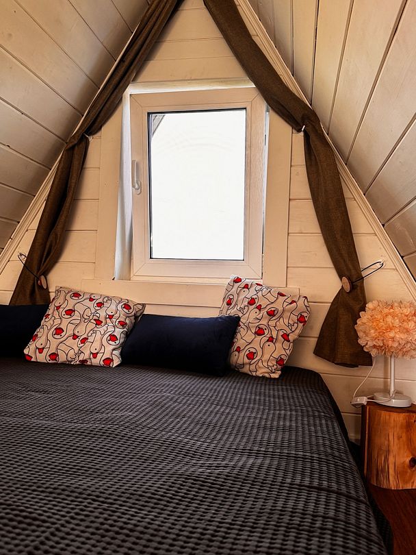 Вас встретит теплая, домашняя атмосфера. Домики площадью 54 кв. м идеально подходит для размещения до четырех взрослых гостей. На верхнем ярусе находится двуспальная кровать, а внизу — раскладной диван.