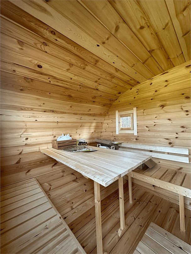К Вашим услугам погреться в бане с панорамным окном на участок. Баня греется до 60-70 градусов, использовать можно без ограничений по времени.