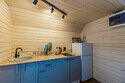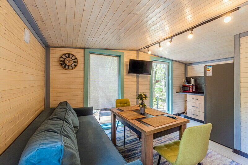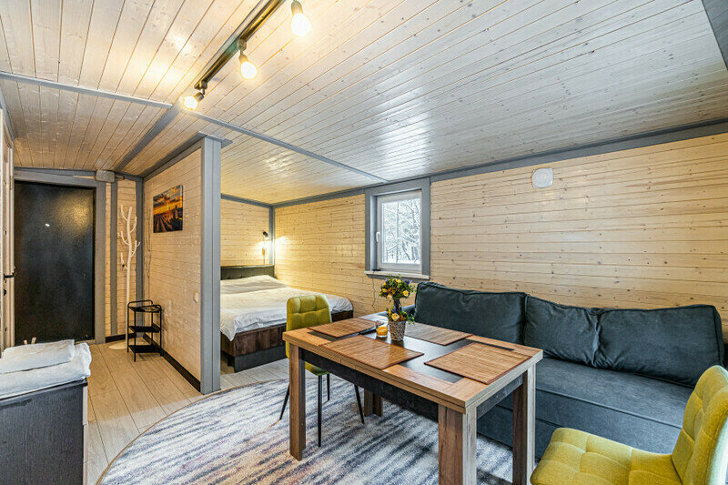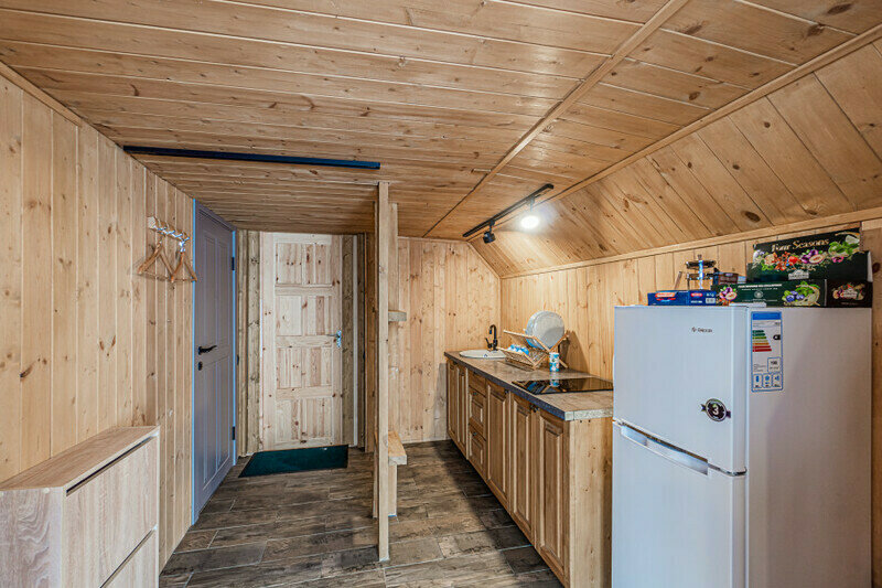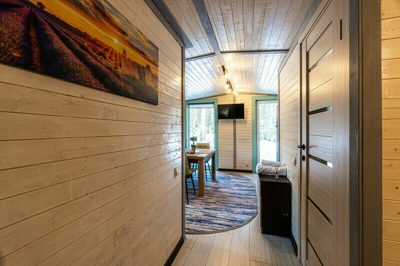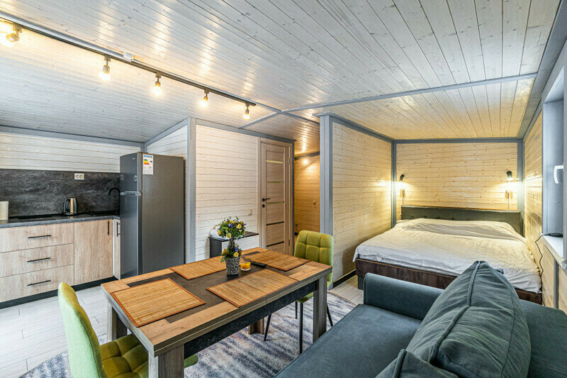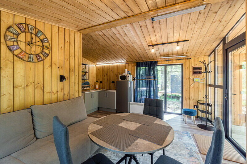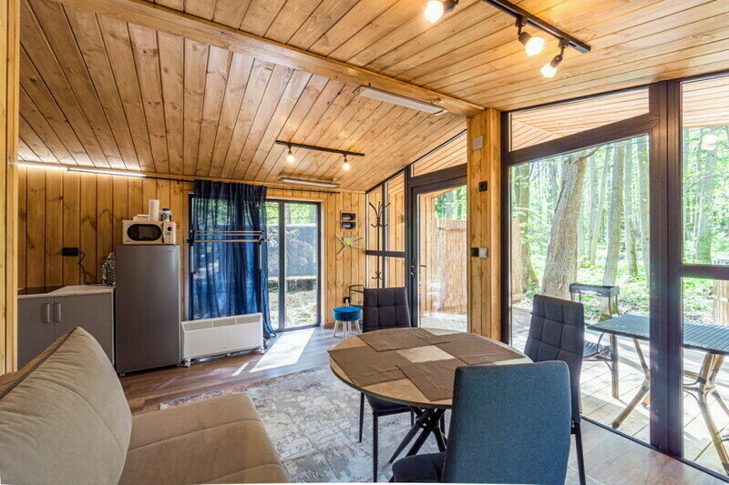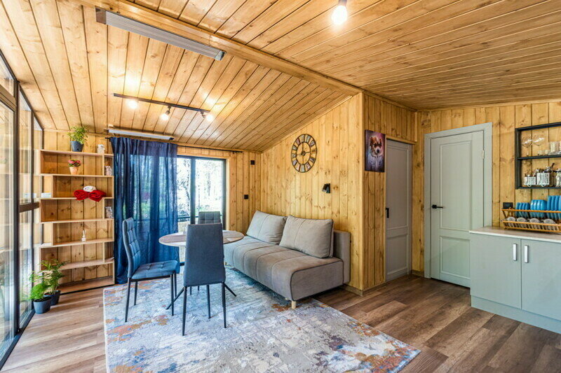 Стильный домик с большим залом, кухней, душевой и туалетом.