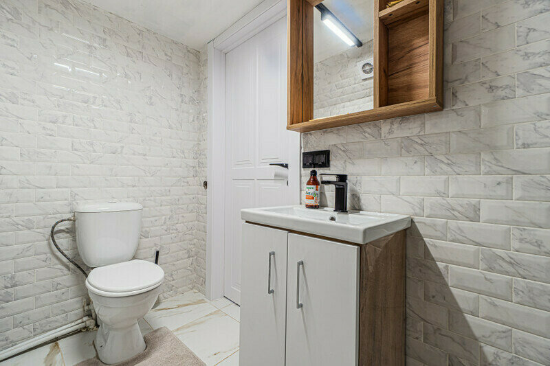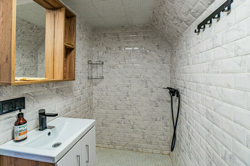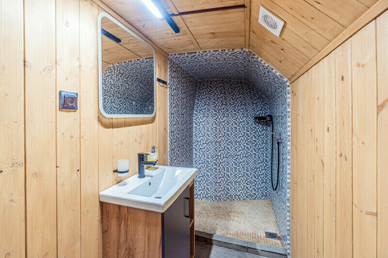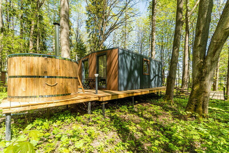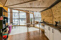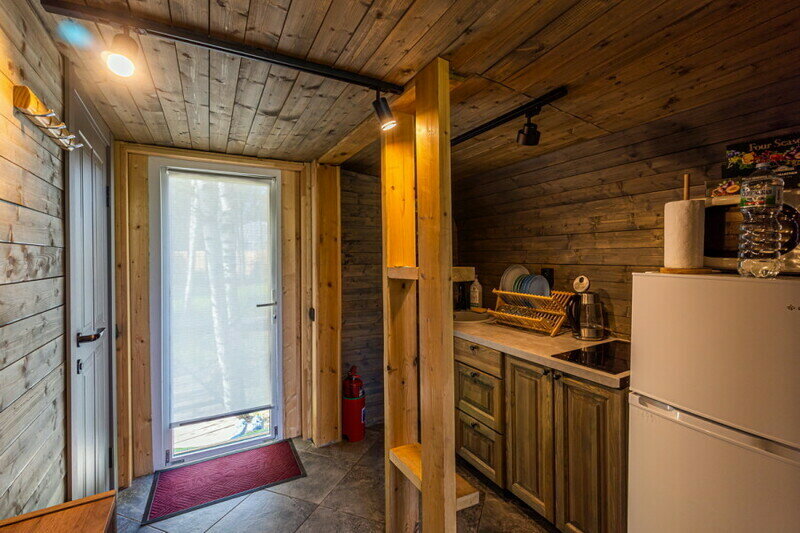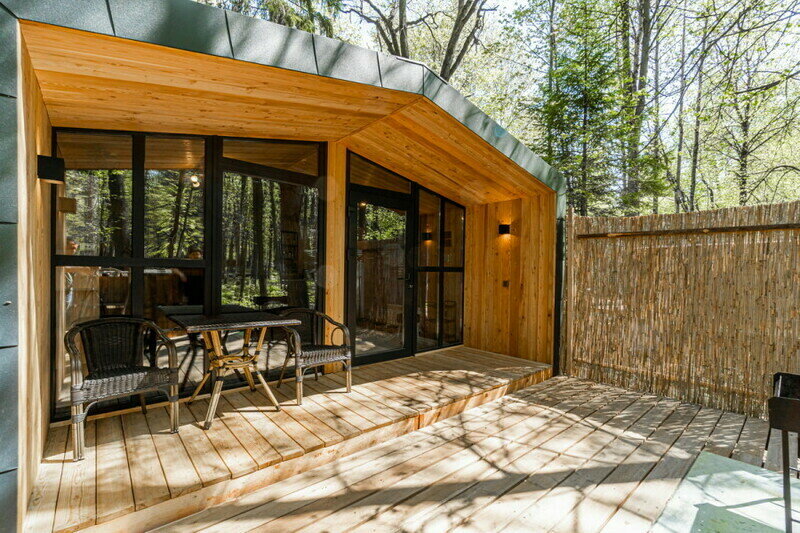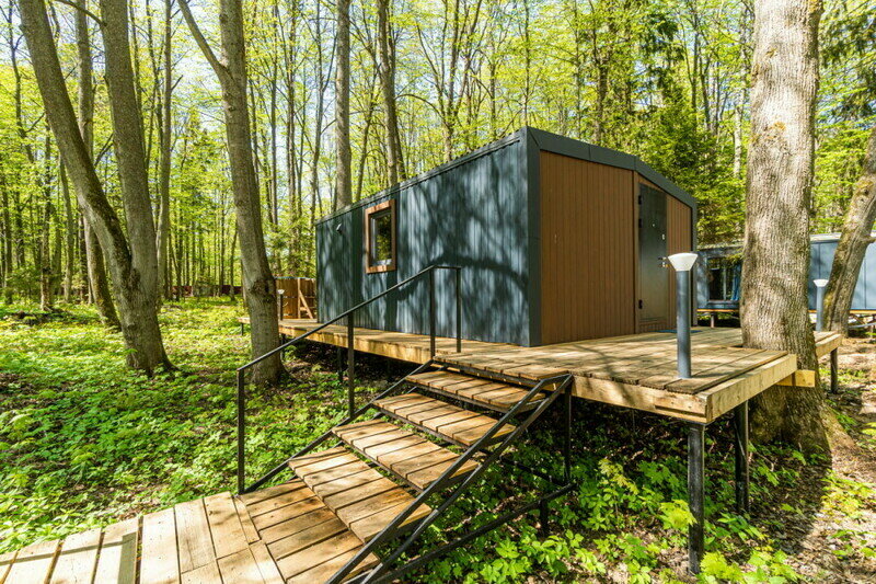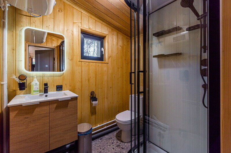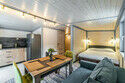 Стильный домик с большим залом, кухней, душевой и туалетом.