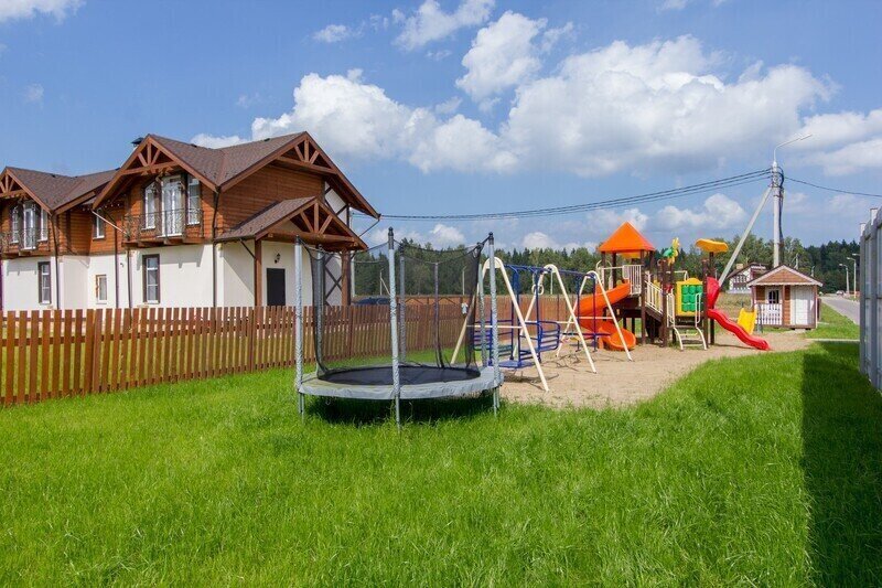 Также на территории поселка имеется универсальная спортивная площадка, где можно заниматься баскетболом, волейболом или мини-футболом на свежем воздухе. Для детей предусмотрен оригинальный игровой домик с горкой, скалодромом, веревочной лестницей, рукоходом, качелями и батутом. Этот игровой домик создан для обеспечения удовольствия и развлечений для малышей.