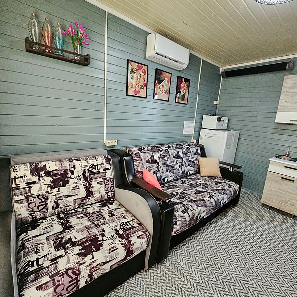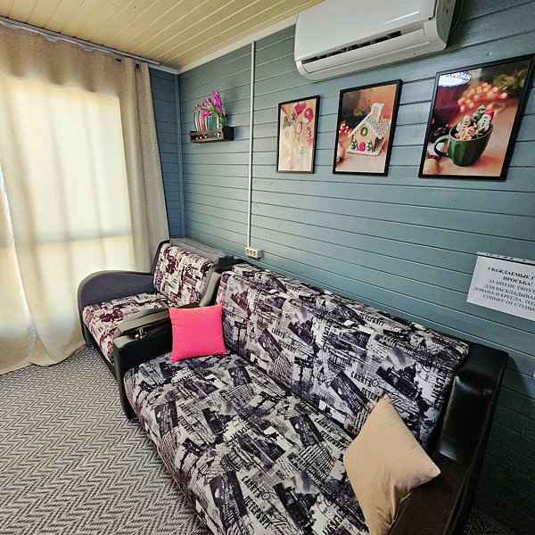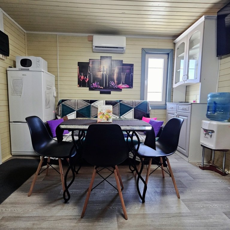 Удобства в доме: 2-х спальный диван, 1 спальное кресло-кровать, шкаф, буфет, ЖК телевизор большой, холодильник, свч, кулер/чайник, фен, совместный сан. узел.