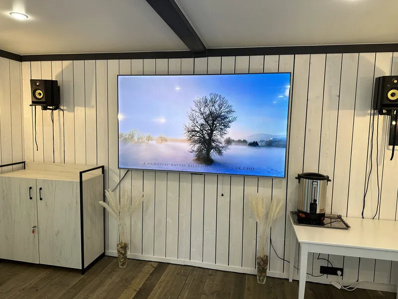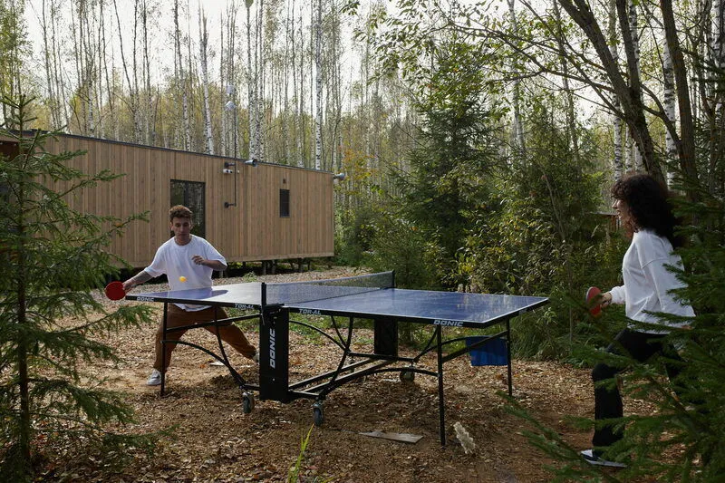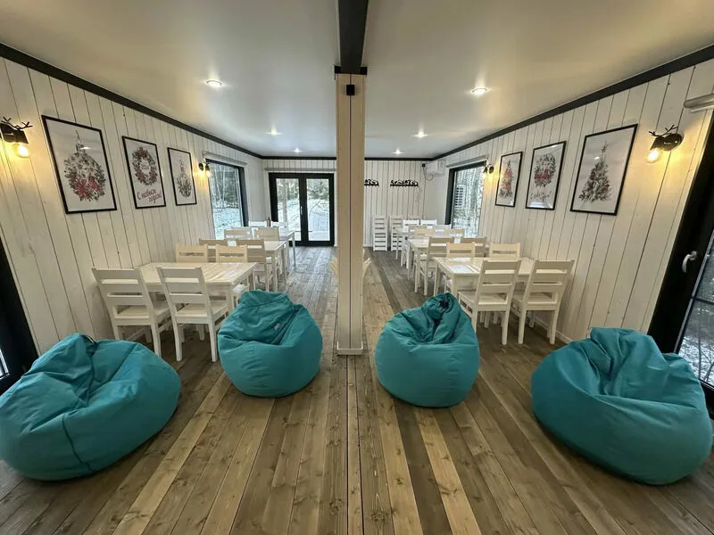 Чтобы гостям всегда было где собраться, независимо от погоды за окном, построен современный, теплый и уютный Банкетный зал! В нем проводятся кинопоказы, игры, работает караоке, а еще это прекрасный коворкинг в лесу!