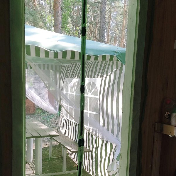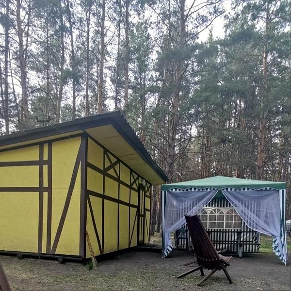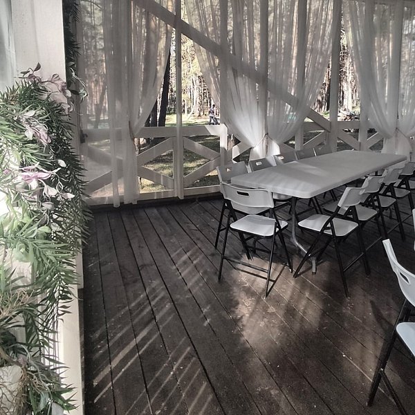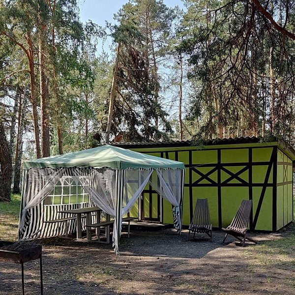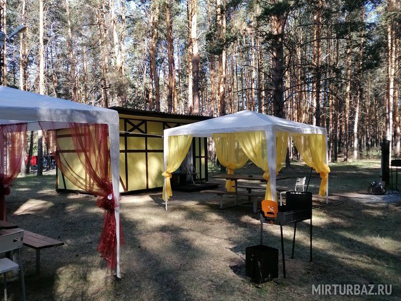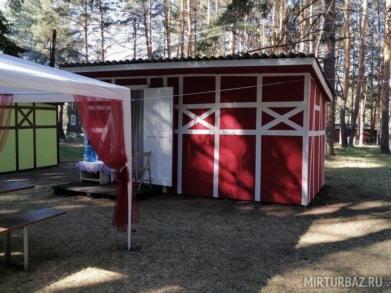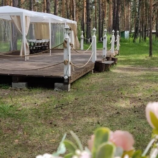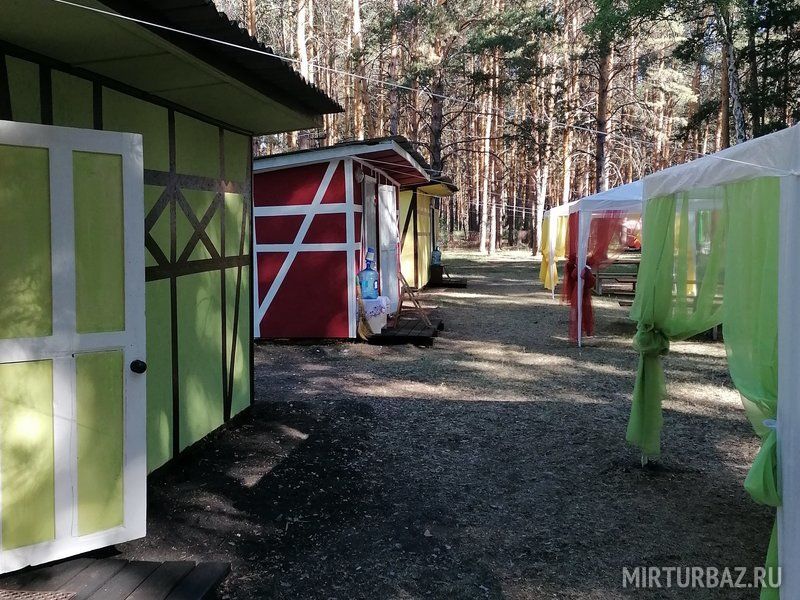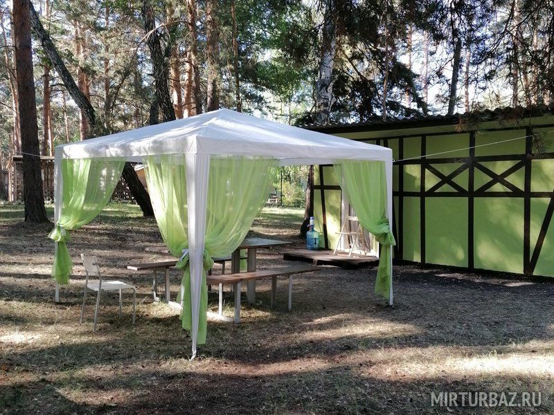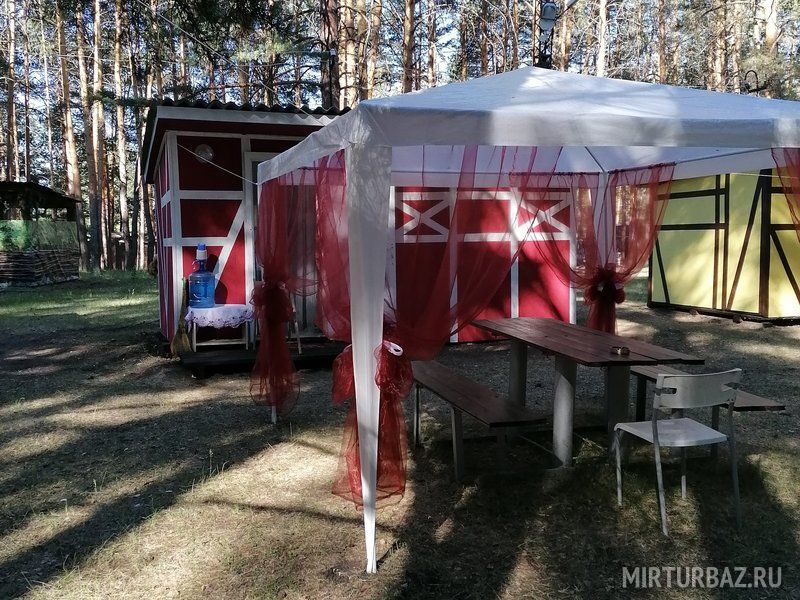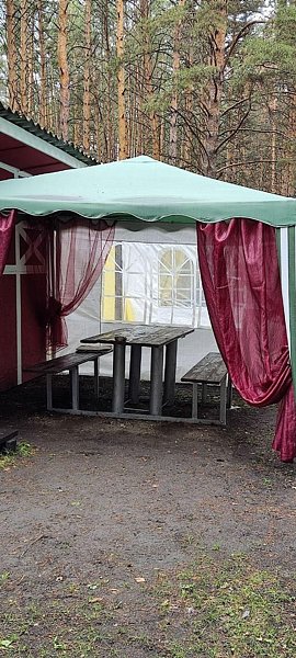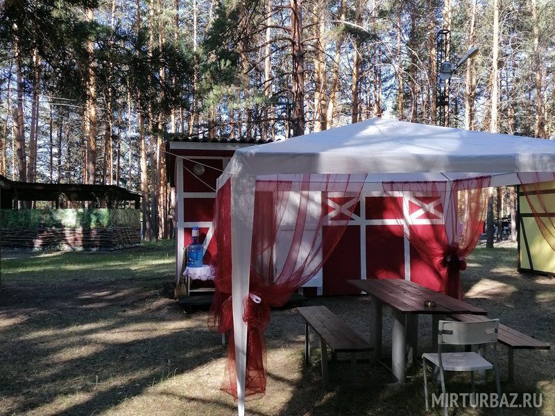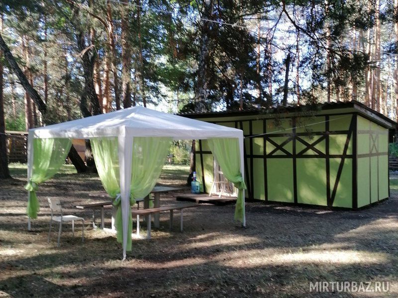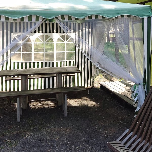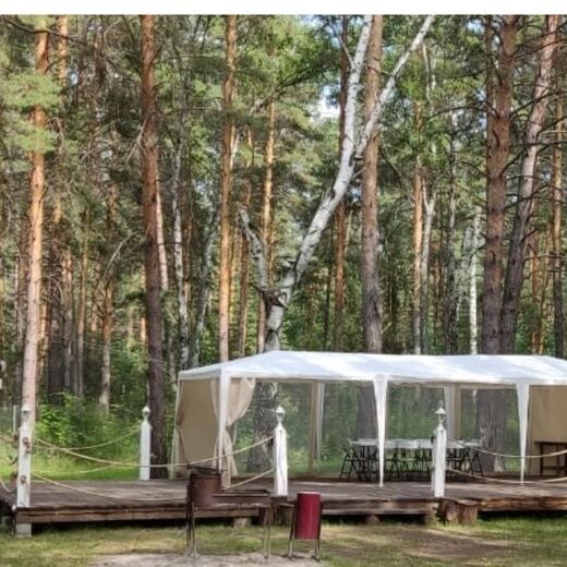 Летний шатер на деревянном настиле, свет, вода, туалет, мангал, стол и стулья, холодильник, чайник, детский городок, парковка