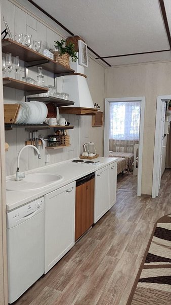 Оборудованная всем необходимым кухня: столовая и кухонная посуда, посудомоечная машина, плита, кофеварка, СВЧ, холодильник, мультиварка, тостер, чайник.