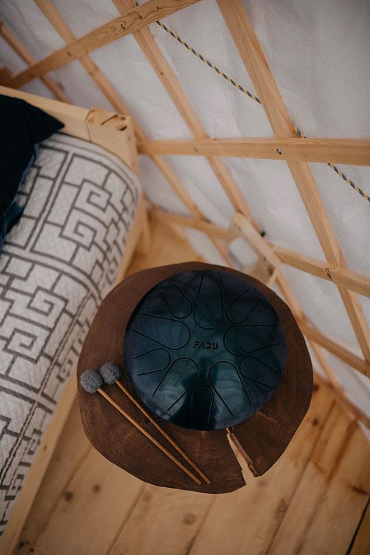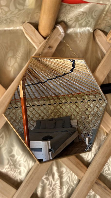 Интерьер юрты выполнен в современном минималистичном стиле, выход из юрты открывает вид на горы с белоснежными вершинами, перед входной дверью оборудована мини-терраса со столиком и стульями. В юрте имеется одна двуспальная кровать и все необходимое для комфортного отдыха.