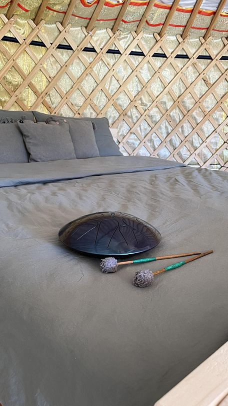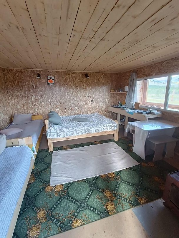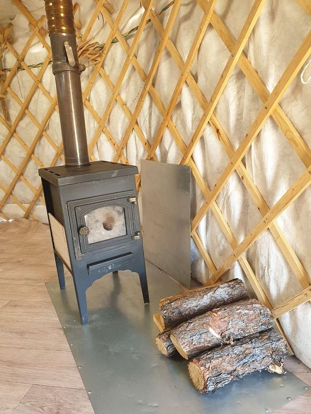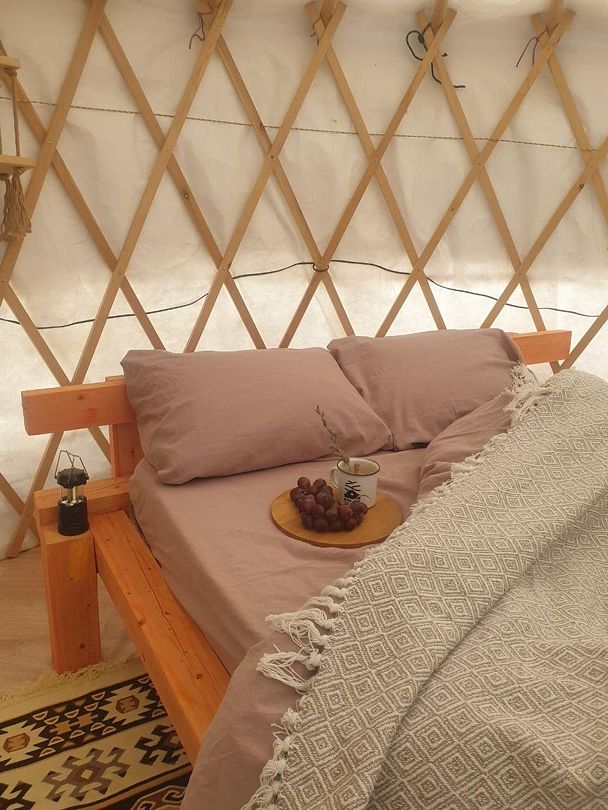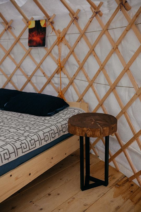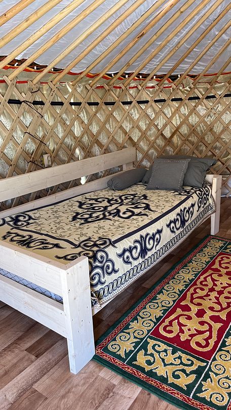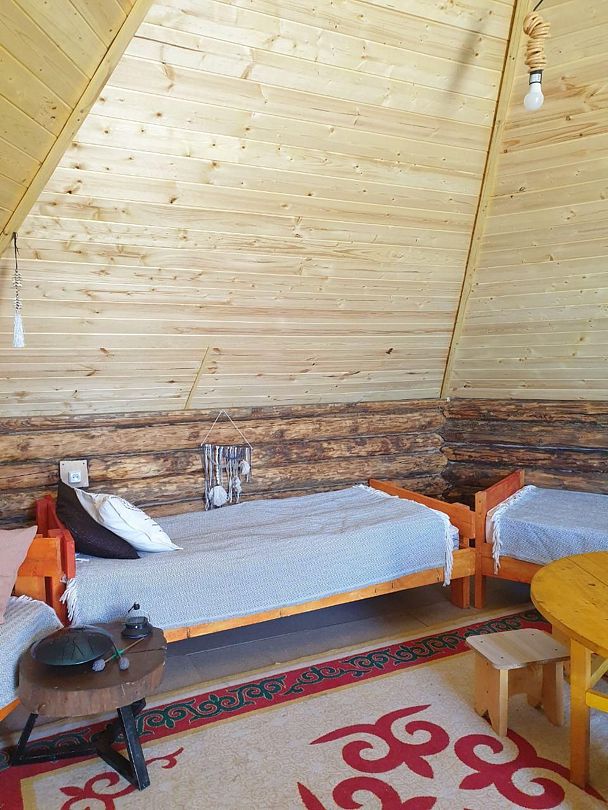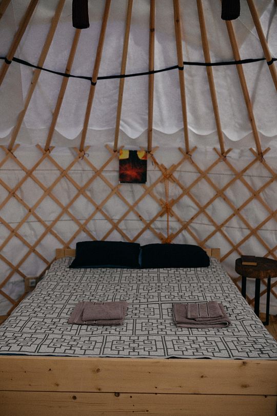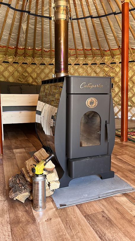 Юрта на двоих представляет собой небольшое помещение с одной кроватью и печкой. Имеется столик при диване и коврик при двери. Юрты отличаются комфортными кроватями, мебелью из натуральных материалов, постельным и текстилем из натуральных тканей.