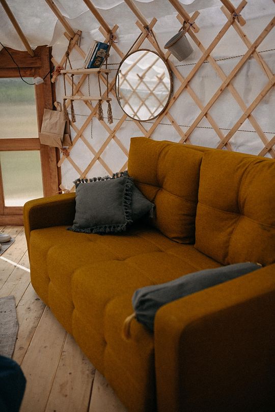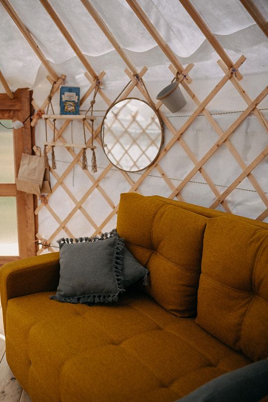 Интерьер юрты выполнен в современном минималистичном стиле.