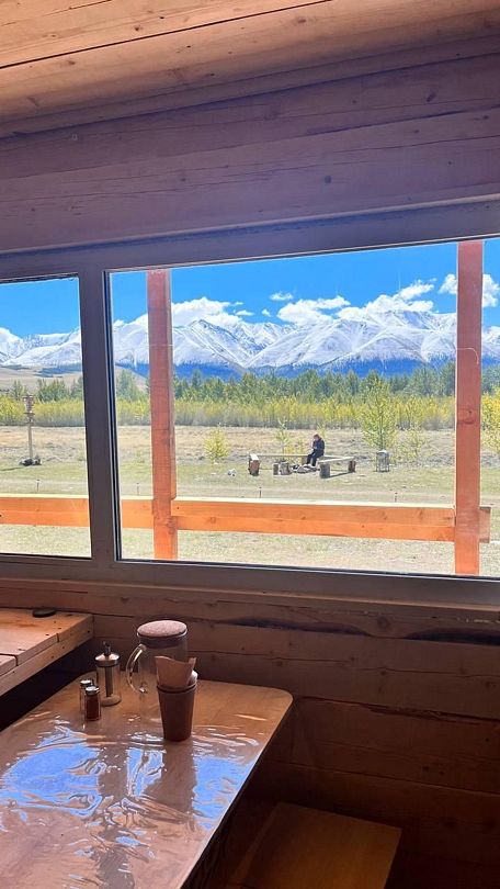 Выход из юрты открывает вид на горы с белоснежными вершинами. Перед входной дверью оборудована мини-терраса со столиком и стульями.