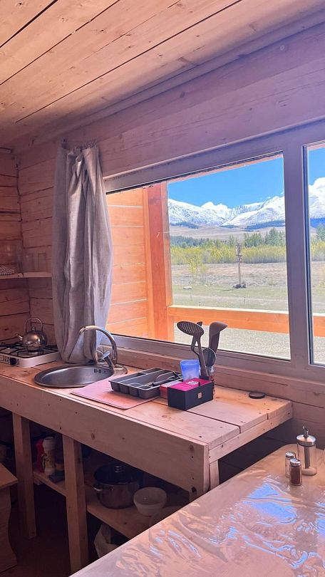 Сканди-дом — это деревянный туристический домик, размерами 4х4 метра. Имеется небольшая терраса, панорамное окно с видом на горы. Внутри есть печка, освещение.